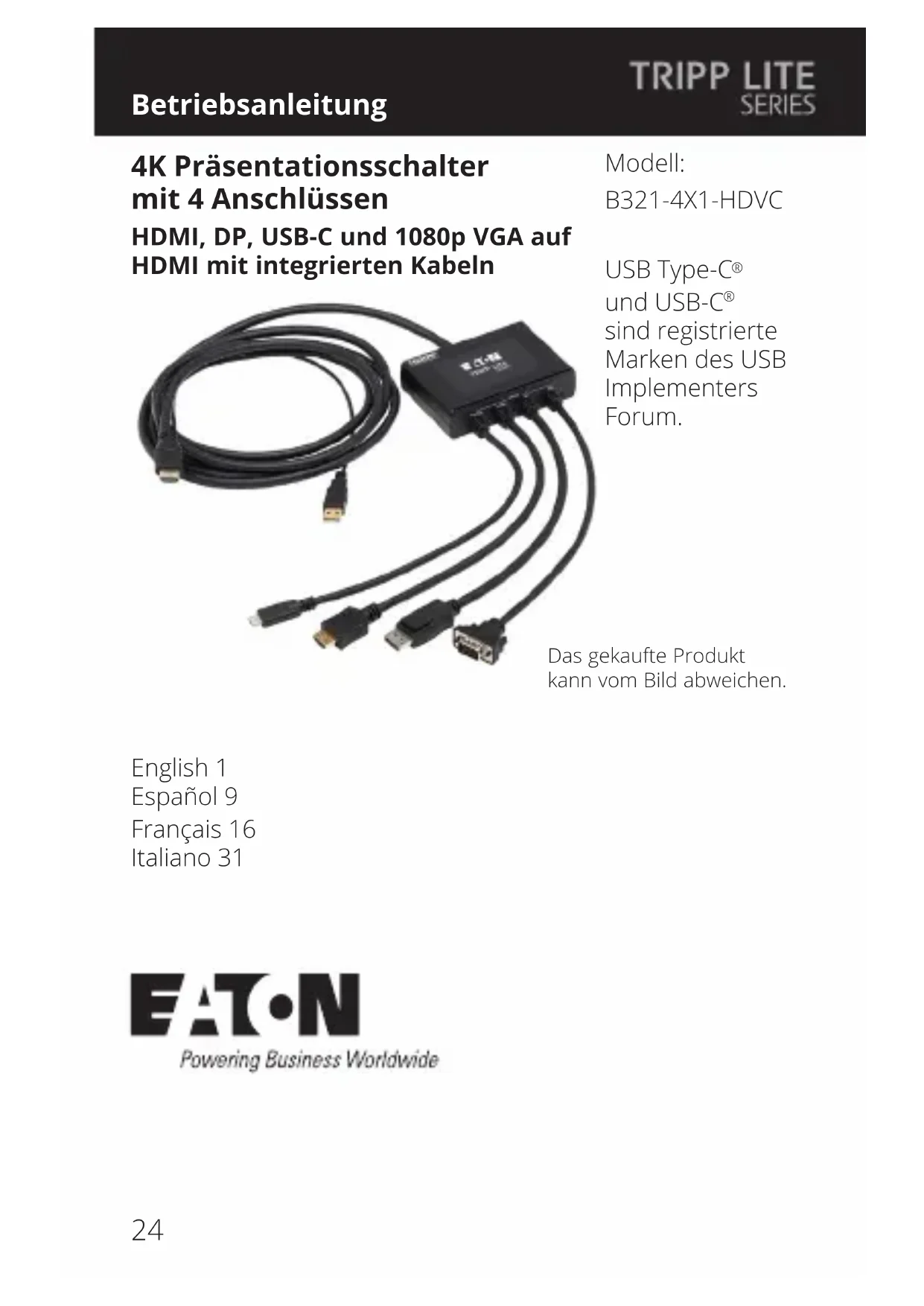 Netzkabel der Type-C-Quelle HDMI-Quelle DisplayPort- Quelle VGA-Quelle Einfaches Wechseln der Quellen durch manuelles Drücken einer Schaltertaste Optional28 Technische Daten Eingangsanschlüsse (Stecker) HDMI, DisplayPort, USB-C, VGA Ausgangsanschlüsse HDMI (Stecker), USB-A (Stecker), USB-C (Buchse) Maximale Auösung HDMI, DisplayPort, USB-C: 4096x2160 bei 60Hz (4:4:4) VGA: 1920x1080 bei 60Hz Maße der Einheit (H x B x T) 4,25 x 3 x 0,9 Zoll / 10,8 x 7,5 x 2,4 cm Gewicht der Einheit 0,77lb. / 0,35kg Betriebstemperatur 32°F bis 104°F / 0°C bis 40°C Lagertemperatur 5°F bis 122°F / -15°C bis 50°C Relative Feuchtigkeit 0 bis 85%, nicht kondensierend PD 3.0-Auadung 20V 5A (90W)29 1Jahr eingeschränkte Garantie Wir garantieren, dass unsere Produkte frei von Material- und Verarbeitungsfehlern sind, und zwar für einen Zeitraum von einem (1) Jahr ab dem Datum des Erstkaufs. Unsere Verpichtung im Rahmen dieser Garantie beschränkt sich auf die Reparatur oder den Ersatz (nach eigenem Ermessen) der fehlerhaften Produkte. Besuchen Sie Tripplite. Eaton.com/support/product-returns, bevor Sie Geräte zur Reparatur zurücksenden. Diese Garantie gilt nicht für Geräte, die durch Unfall, Fahrlässigkeit oder falsche Anwendung beschädigt wurden oder in irgendeiner Weise geändert oder modiziert wurden.