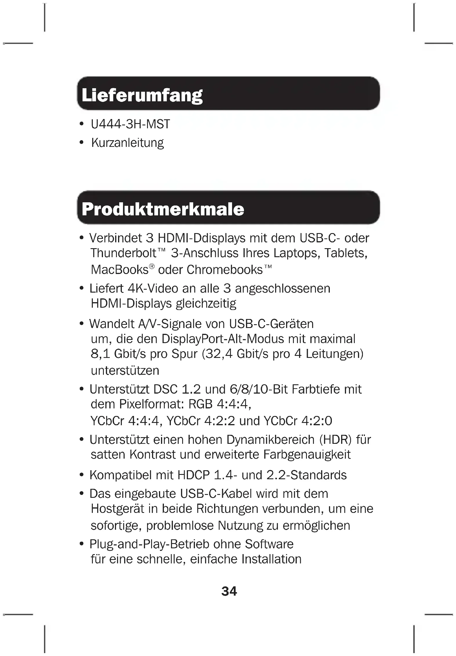 sind registrierte Marken des USB Implementers Forum. Kurzanleitung USB-C-zu-HDMI MST-Adapter (Stecker/3xF), 4K 60 Hz, DP 1.4 Alt-Modus Modell: U444-3H-MST English 1 • Español 9 Français 17 • Русский 2534 Lieferumfang Produktmerkmale