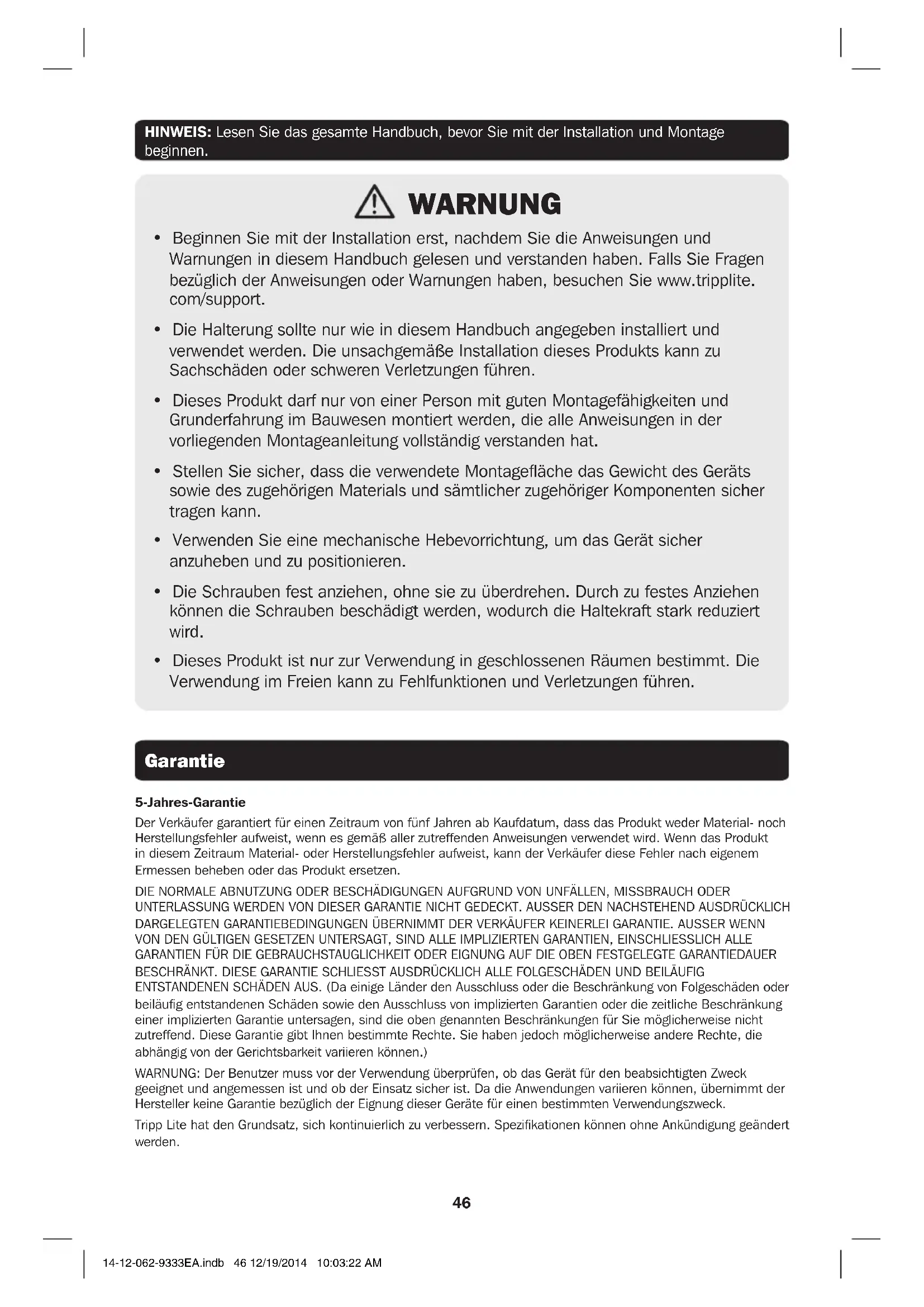 (33 - 68,5 cm) 10kg MÁX English 1 • Español 12 • Français 23 • Русский 34 14-12-062-9333EA.indb 45 12/19/2014 10:03:22 AM46 HINWEIS: Lesen Sie das gesamte Handbuch, bevor Sie mit der Installation und Montage beginnen. Garantie WARNUNG