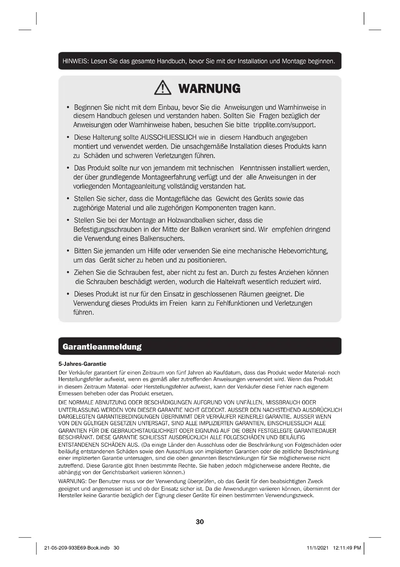 - Dieses Produkt ist nur für den Einsatz in geschlossenen Räumen geeignet. Die Verwendung dieses Produkts im Freien kann zu Fehlfunktionen und Verletzungen führen. 5-Jahres-Garantie Der Verkäufer garantiert für einen Zeitraum von fünf Jahren ab Kaufdatum, dass das Produkt weder Material- noch Herstellungsfehler aufweist, wenn es gemäß aller zutreffenden Anweisungen verwendet wird. Wenn das Produkt in diesem Zeitraum Material- oder Herstellungsfehler aufweist, kann der Verkäufer diese Fehler nach eigenem Ermessen beheben oder das Produkt ersetzen. DIE NORMALE ABNUTZUNG ODER BESCHÄDIGUNGEN AUFGRUND VON UNFÄLLEN, MISSBRAUCH ODER UNTERLASSUNG WERDEN VON DIESER GARANTIE NICHT GEDECKT. AUSSER DEN NACHSTEHEND AUSDRÜCKLICH DARGELEGTEN GARANTIEBEDINGUNGEN ÜBERNIMMT DER VERKÄUFER KEINERLEI GARANTIE. AUSSER WENN VON DEN GÜLTIGEN GESETZEN UNTERSAGT, SIND ALLE IMPLIZIERTEN GARANTIEN, EINSCHLIESSLICH ALLE GARANTIEN FÜR DIE GEBRAUCHSTAUGLICHKEIT ODER EIGNUNG AUF DIE OBEN FESTGELEGTE GARANTIEDAUER BESCHRÄNKT. DIESE GARANTIE SCHLIESST AUSDRÜCKLICH ALLE FOLGESCHÄDEN UND BEILÄUFIG ENTSTANDENEN SCHÄDEN AUS. (Da einige Länder den Ausschluss oder die Beschränkung von Folgeschäden oder beiläufig entstandenen Schäden sowie den Ausschluss von implizierten Garantien oder die zeitliche Beschränkung einer implizierten Garantie untersagen, sind die oben genannten Beschränkungen für Sie möglicherweise nicht zutreffend. Diese Garantie gibt Ihnen bestimmte Rechte. Sie haben jedoch möglicherweise andere Rechte, die abhängig von der Gerichtsbarkeit variieren können.) WARNUNG: Der Benutzer muss vor der Verwendung überprüfen, ob das Gerät für den beabsichtigten Zweck geeignet und angemessen ist und ob der Einsatz sicher ist. Da die Anwendungen variieren können, übernimmt der Hersteller keine Garantie bezüglich der Eignung dieser Geräte für einen bestimmten Verwendungszweck. 21-05-209-933E69-Book.indb 3021-05-209-933E69-Book.indb 30 11/1/2021 12:11:49 PM11/1/2021 12:11:49 PM31 WICHTIG: Überprüfen Sie, ob Sie alle in der Komponentenliste aufgeführten Teile erhalten haben, bevor Sie mit der Installation beginnen. Wenn Teile fehlen oder fehlerhaft sind, besuchen Sie tripplite.com/support für den Kundendienst. Komponentenliste A (x2) F (x3) B (x2) C (x1) D (x1) M5x10 (x4) Verankerungsbolzen (x4) Betonanker (x4) D6 Beilagscheibe (x4) Paket M Paket W M5x14 (x4) M8x45 (x4) M6x14 (x4) Beilagscheibe (4 x) M6x25 (4) Kleiner Abstandhalter (x4) M8x25 (x4) Großer Abstandhalter (x4) 21-05-209-933E69-Book.indb 3121-05-209-933E69-Book.indb 31 11/1/2021 12:11:49 PM11/1/2021 12:11:49 PM32
