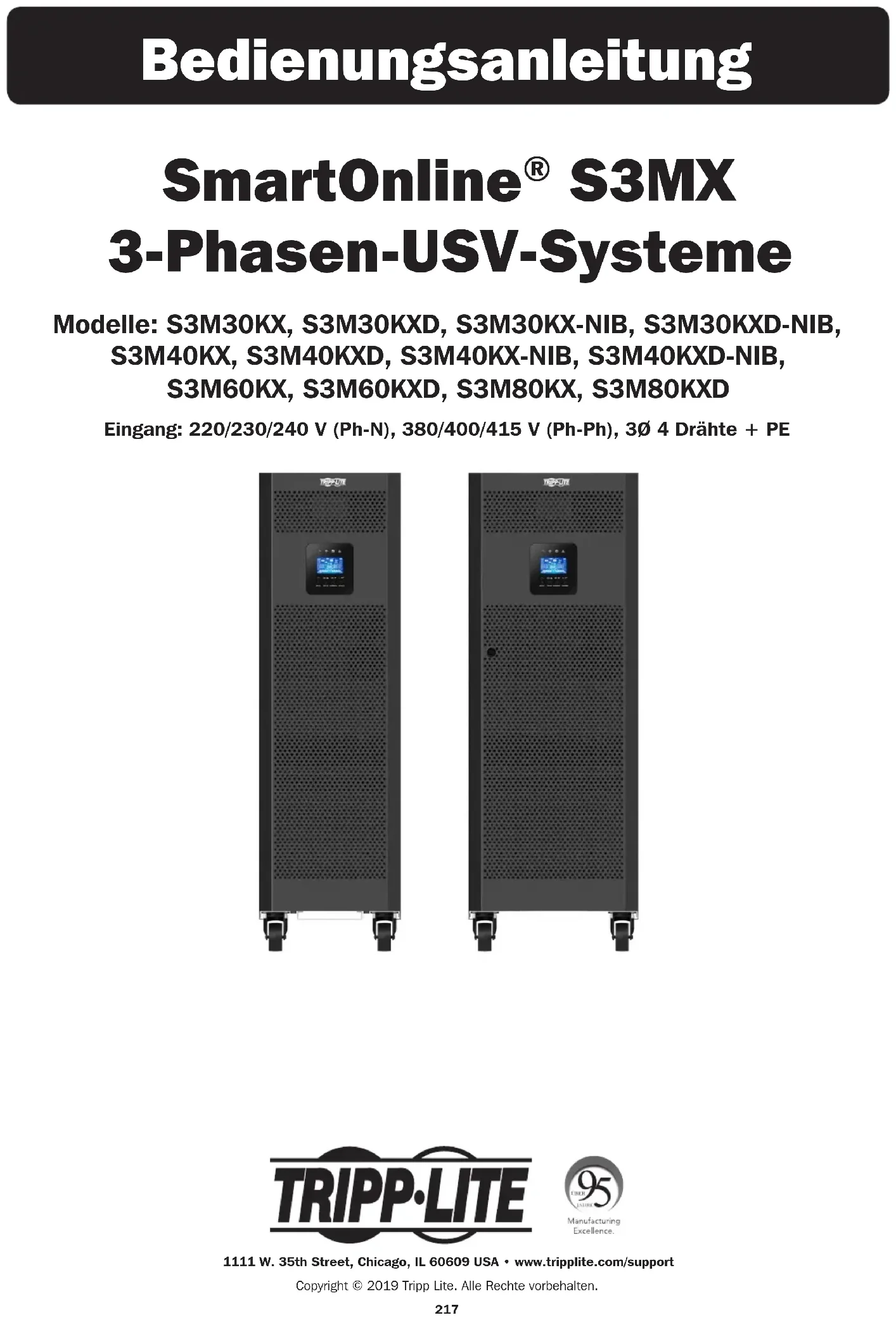 Dieses Handbuch enthält wichtige Anweisungen und Warnungen, die bei Installation und Wartung aller Tripp Lite SmartOnline S3MX 3-Phasen 30 kVA, 40 kVA, 60 kVA und 80 kVA UPS-Systeme und ihrer Batterien beachtet werden sollten. Die Nichtbeachtung dieser Warnungen kann Ihre Garantie beeinträchtigen.