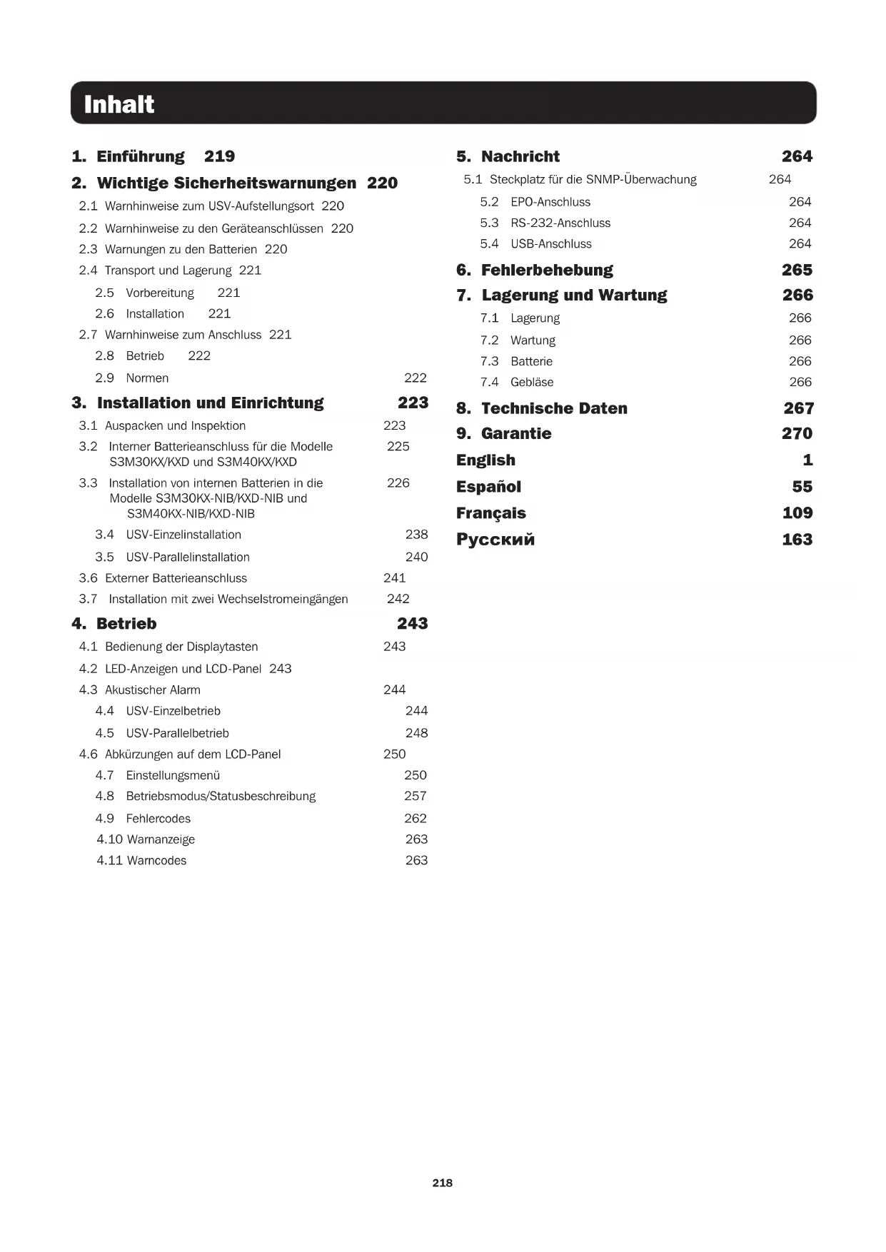 - Die Batterie darf nur von einem autorisierten Servicemitarbeiter gegen eine Batterie mit demselben Anschlusswert und Typ (versiegelter Bleiakku) ausgewechselt werden. WARNHINWEIS: Um lebensgefährliche Bedingungen bei der USV-Installation und -Wartung zu vermeiden, dürfen diese Aufgaben nur von qualifizierten und erfahrenen Elektrikern durchgeführt werden. Bitte lesen Sie dieses Bedienungshandbuch und die Sicherheitsanweisungen aufmerksam, bevor Sie die Einheit installieren oder verwenden.221