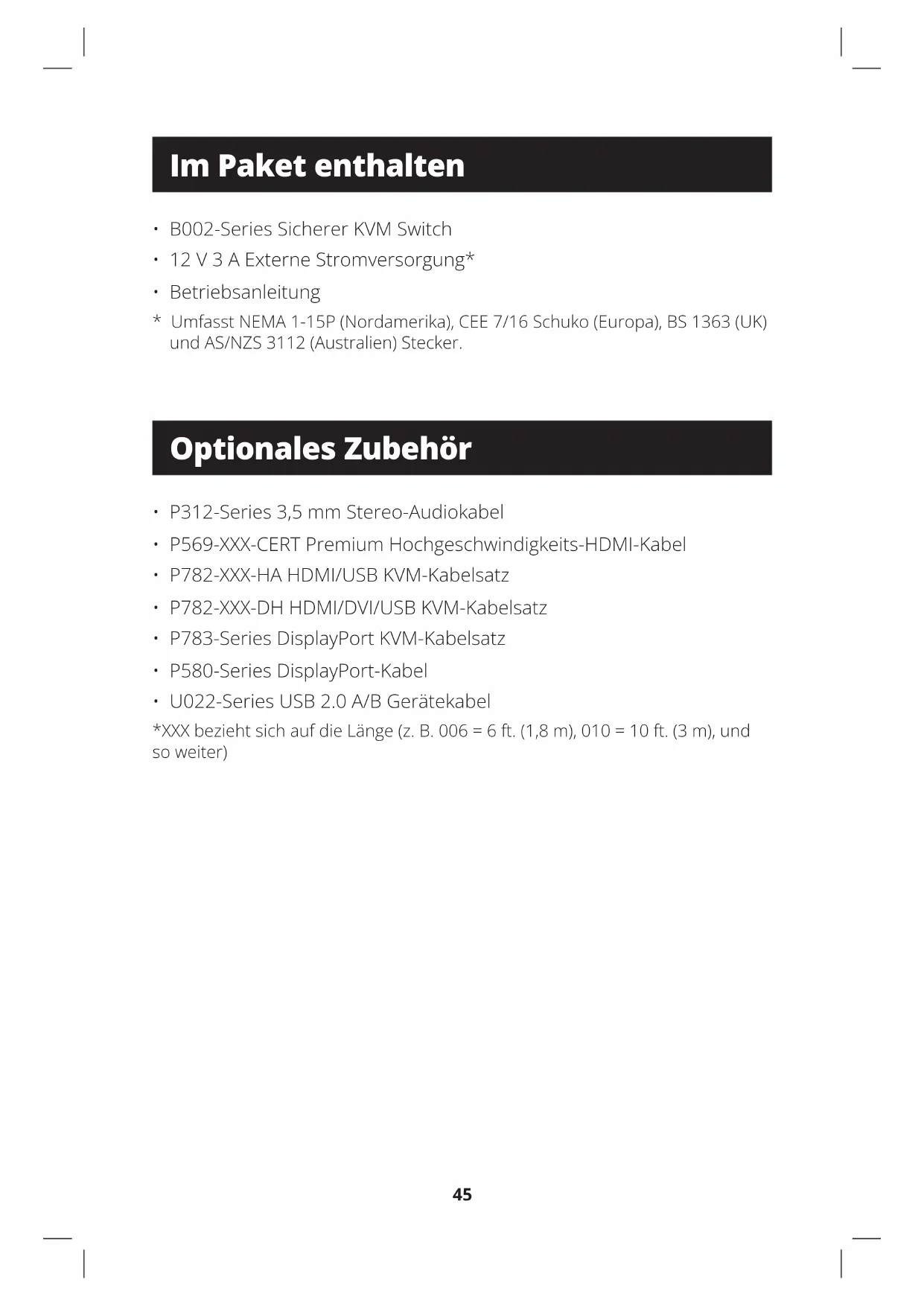 - U022-Series USB 2.0 A/B Gerätekabel *XXX bezieht sich auf die Länge (z. B. 006 = 6 ft. (1,8 m), 010 = 10 ft. (3 m), und so weiter) Im Paket enthalten Optionales Zubehör46