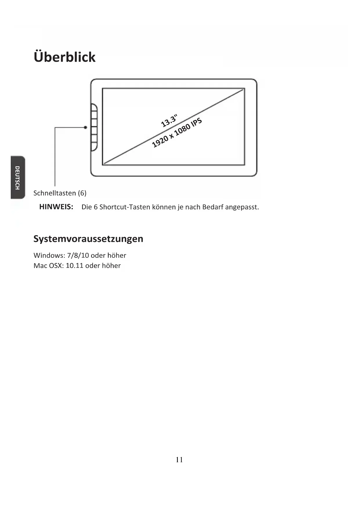 ID1330 mit dem Typ-C-Kabel an Ihren Computer anschließen und die Netztaste 3 Sekunden lang gedrückt halten. Lease-Stecker in anderen Adapter, wenn Sie über 70% verwenden möchten Helligkeit. 13DEUTSCH Einrichtung von ID1330 Wissenswertes vor der Installaon