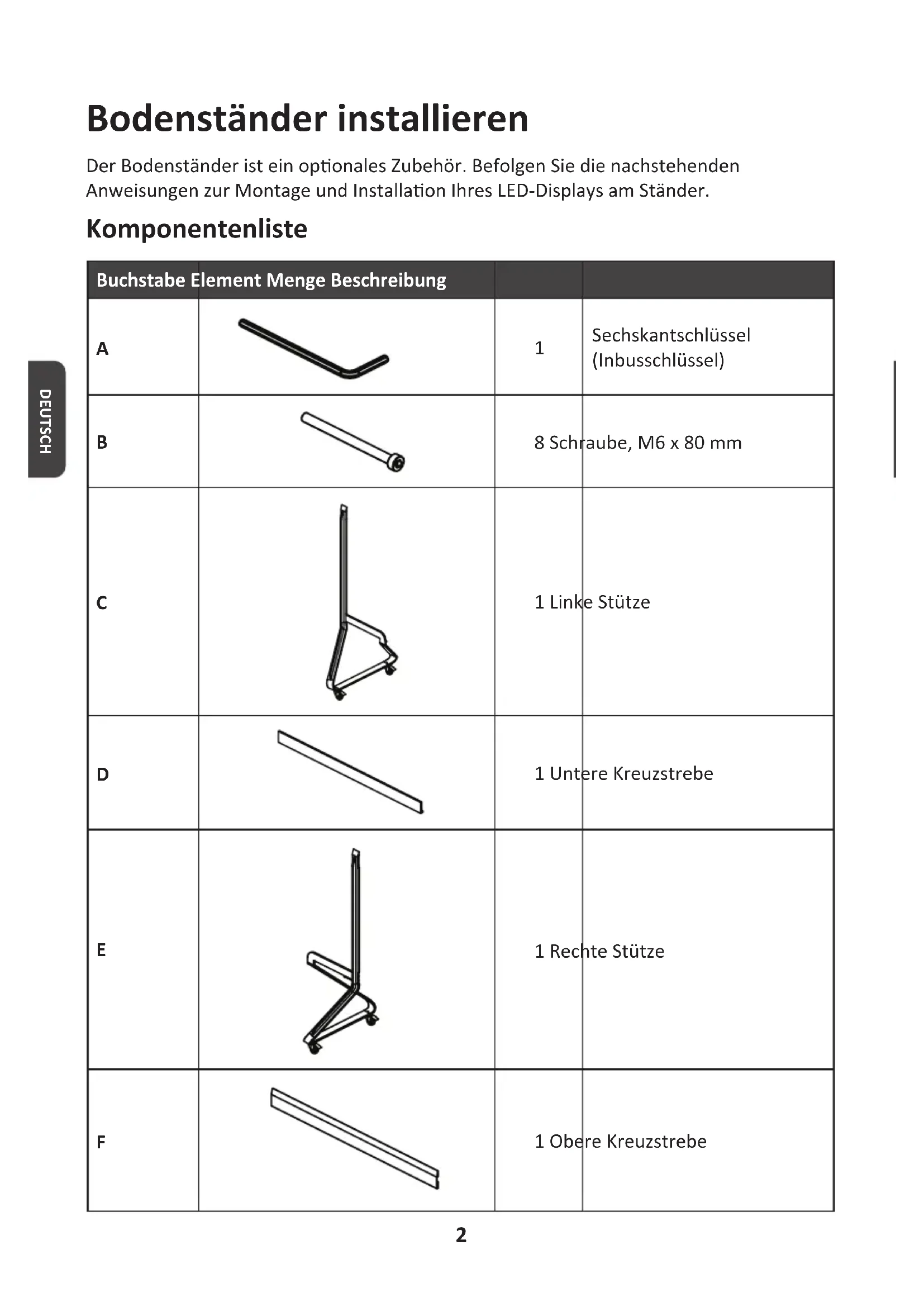 HDMI OUT USBUSBUSBRS2322 DEUTSCH Bodenständer installieren Der Bodenständer ist ein oponales Zubehör. Befolgen Sie die nachstehenden Anweisungen zur Montage und Installaon Ihres LED-Displays am Ständer. Komponentenliste Buchstabe Element Menge Beschreibung