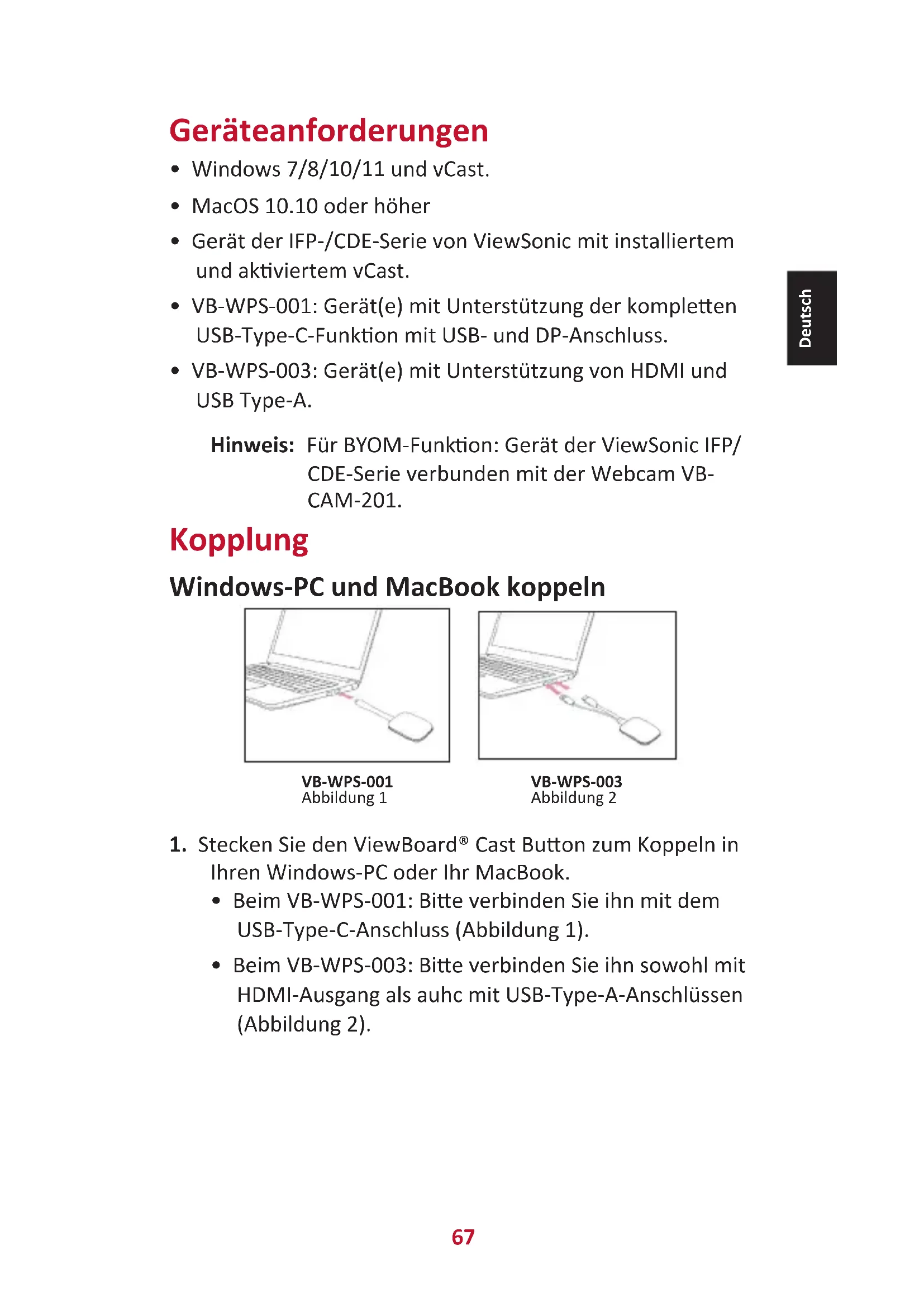 - VB-WPS-003: Gerät(e) mit Unterstützung von HDMI und USB Type-A. Hinweis:ᅠ Für BYOM-Funkon: Gerät der ViewSonic IFP/ CDE-Serie verbunden mit der Webcam VB- CAM-201. Kopplung Windows-PC und MacBook koppeln VB-WPS-001 Abbildung 1 VB-WPS-003 Abbildung 2