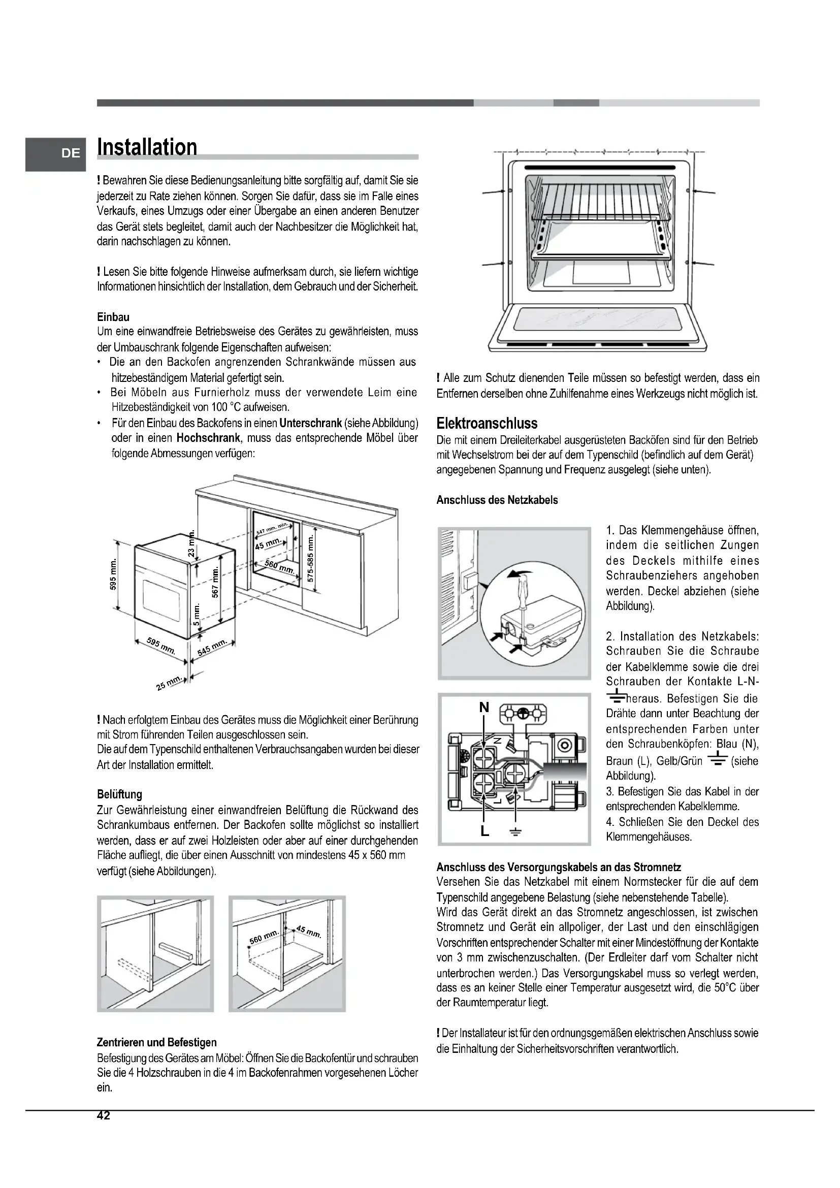 - Für den Einbau des Backofens in einen Unterschrank (siehe Abbildung) oder in einen Hochschrank, muss das entsprechende Möbel über folgende Abmessungen verfügen: 595 mm. 595 mm. 25 mm. 545 mm.5 mm.567 mm.23 mm.575-585 mm.45 mm.560 mm.547 mm. min. ! Nach erfolgtem Einbau des Gerätes muss die Möglichkeit einer Berührung mit Strom führenden Teilen ausgeschlossen sein. Die auf dem Typenschild enthaltenen Verbrauchsangaben wurden bei dieser Art der Installation ermittelt. Belüftung Zur Gewährleistung einer einwandfreien Belüftung die Rückwand des Schrankumbaus entfernen. Der Backofen sollte möglichst so installiert werden, dass er auf zwei Holzleisten oder aber auf einer durchgehenden Fläche auiegt, die über einen Ausschnitt von mindestens 45 x 560 mm verfügt (siehe Abbildungen). 560 mm. 45 mm. Zentrieren und Befestigen Befestigung des Gerätes am Möbel: Öffnen Sie die Backofentür und schrauben Sie die 4 Holzschrauben in die 4 im Backofenrahmen vorgesehenen Löcher ein. ! Alle zum Schutz dienenden Teile müssen so befestigt werden, dass ein Entfernen derselben ohne Zuhilfenahme eines Werkzeugs nicht möglich ist. Elektroanschluss Die mit einem Dreileiterkabel ausgerüsteten Backöfen sind für den Betrieb mit Wechselstrom bei der auf dem Typenschild (bendlich auf dem Gerät) angegebenen Spannung und Frequenz ausgelegt (siehe unten). Anschluss des Netzkabels