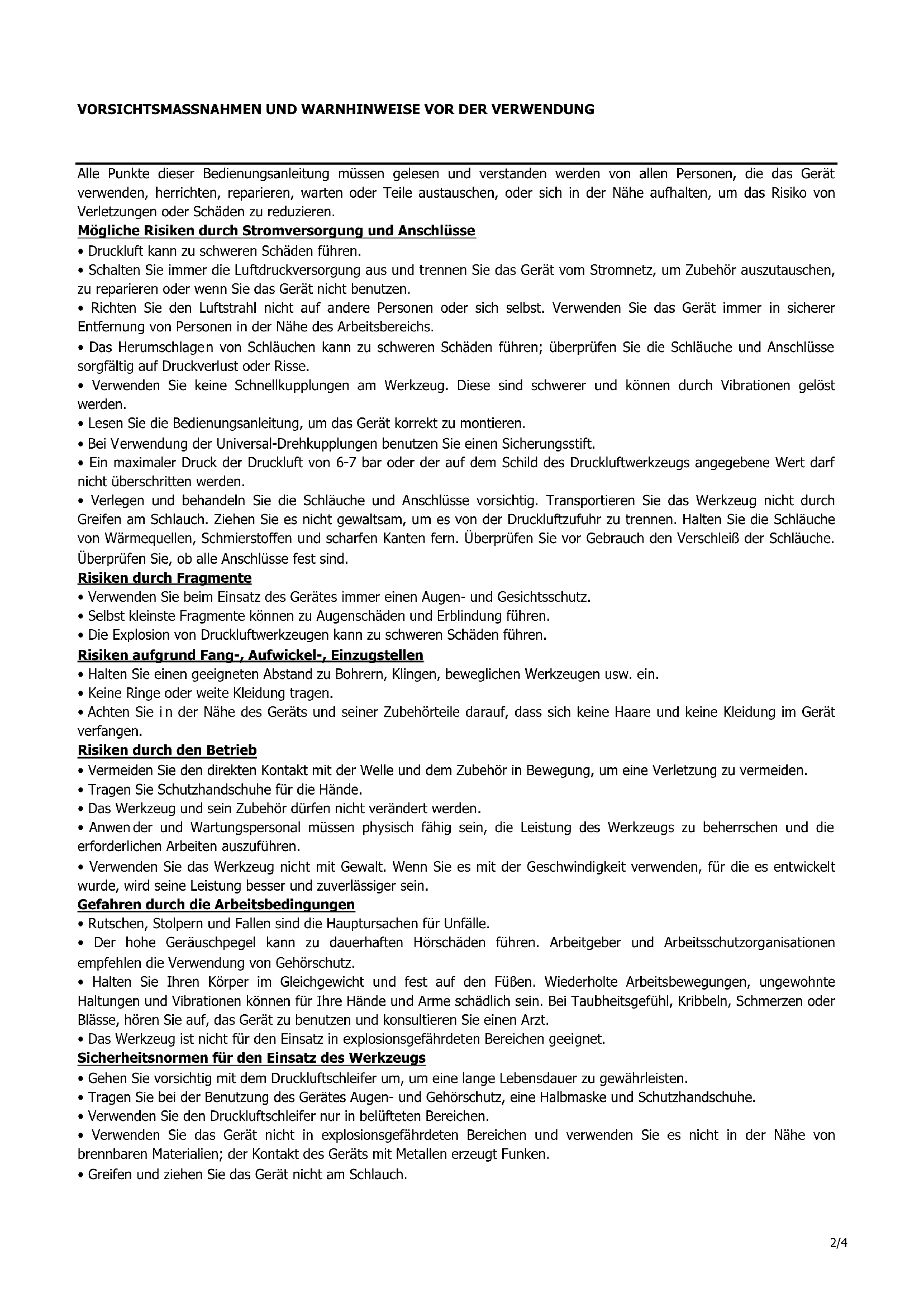 - Die Explosion von Druckluftwerkzeugen kann zu schweren Schäden führen. Risiken aufgrund Fang-, Aufwickel-, Einzugstellen