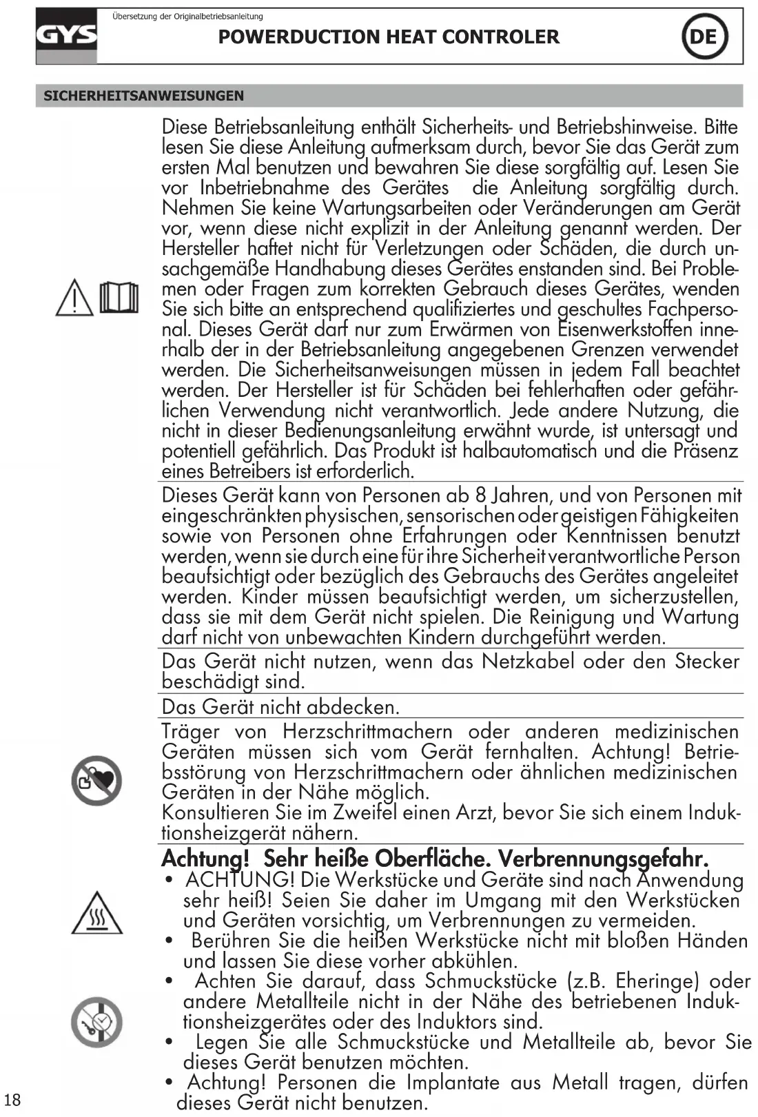 Translation of the original instructionsSICHERHEITSANWEISUNGEN Diese Betriebsanleitung enthält Sicherheits- und Betriebshinweise. Bitte lesen Sie diese Anleitung aufmerksam durch, bevor Sie das Gerät zum ersten Mal benutzen und bewahren Sie diese sorgfältig auf. Lesen Sie vor Inbetriebnahme des Gerätes die Anleitung sorgfältig durch. Nehmen Sie keine Wartungsarbeiten oder Veränderungen am Gerät vor, wenn diese nicht explizit in der Anleitung genannt werden. Der Hersteller haftet nicht für Verletzungen oder Schäden, die durch un- sachgemäße Handhabung dieses Gerätes enstanden sind. Bei Proble- men oder Fragen zum korrekten Gebrauch dieses Gerätes, wenden Sie sich bitte an entsprechend qualifiziertes und geschultes Fachperso- nal. Dieses Gerät darf nur zum Erwärmen von Eisenwerkstoffen inne- rhalb der in der Betriebsanleitung angegebenen Grenzen verwendet werden. Die Sicherheitsanweisungen müssen in jedem Fall beachtet werden. Der Hersteller ist für Schäden bei fehlerhaften oder gefähr- lichen Verwendung nicht verantwortlich. Jede andere Nutzung, die nicht in dieser Bedienungsanleitung erwähnt wurde, ist untersagt und potentiell gefährlich. Das Produkt ist halbautomatisch und die Präsenz eines Betreibers ist erforderlich. Dieses Gerät kann von Personen ab 8 Jahren, und von Personen mit eingeschränkten physischen, sensorischen oder geistigen Fähigkeiten sowie von Personen ohne Erfahrungen oder Kenntnissen benutzt werden, wenn sie durch eine für ihre Sicherheit verantwortliche Person beaufsichtigt oder bezüglich des Gebrauchs des Gerätes angeleitet werden. Kinder müssen beaufsichtigt werden, um sicherzustellen, dass sie mit dem Gerät nicht spielen. Die Reinigung und Wartung darf nicht von unbewachten Kindern durchgeführt werden. Das Gerät nicht nutzen, wenn das Netzkabel oder den Stecker beschädigt sind. Das Gerät nicht abdecken. Träger von Herzschrittmachern oder anderen medizinischen Geräten müssen sich vom Gerät fernhalten. Achtung! Betrie- bsstörung von Herzschrittmachern oder ähnlichen medizinischen Geräten in der Nähe möglich. Konsultieren Sie im Zweifel einen Arzt, bevor Sie sich einem Induk- tionsheizgerät nähern. Achtung! Sehr heiße Oberäche. Verbrennungsgefahr.