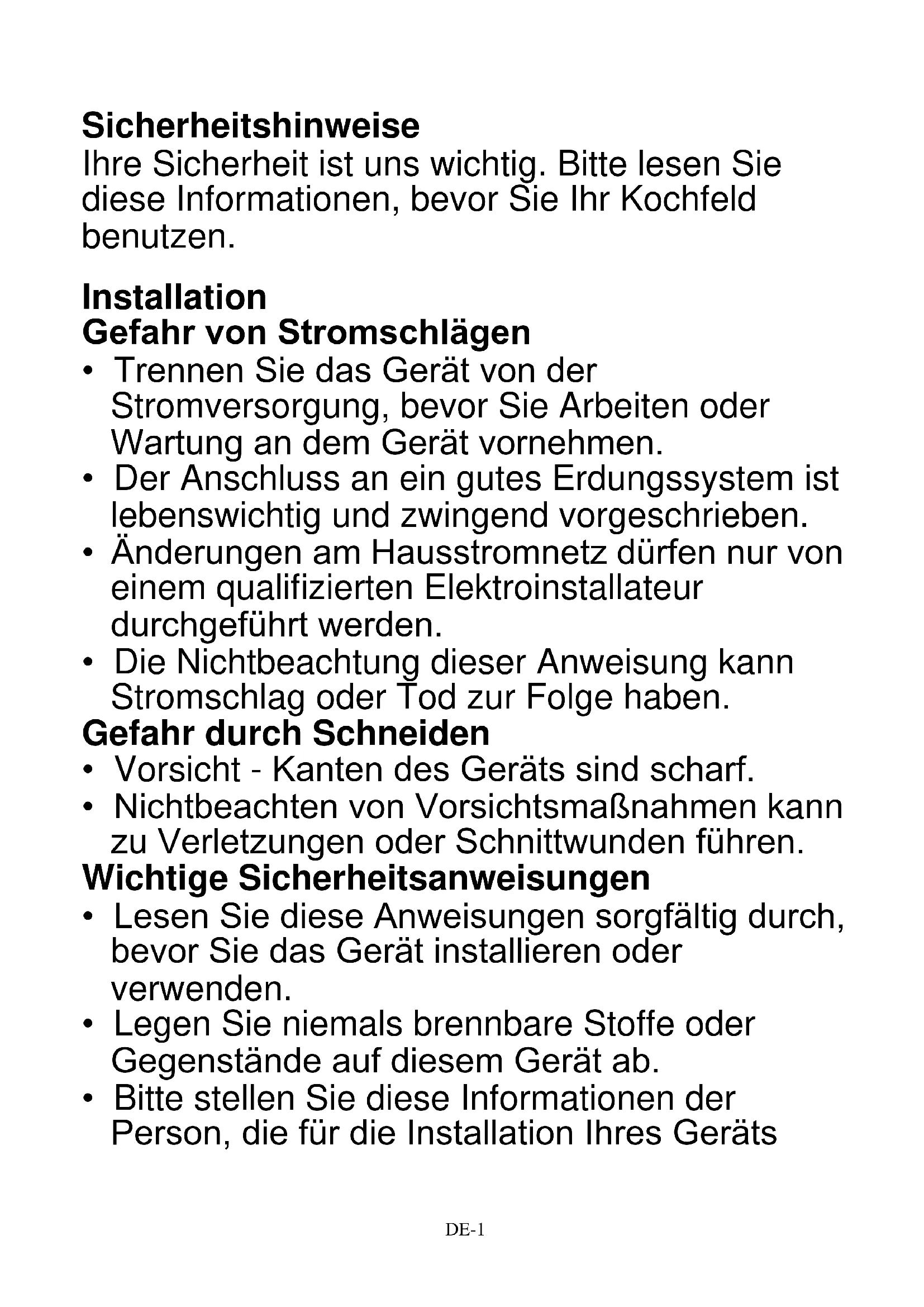 - Utilize panelas cujo diâmetro seja tão grande como o gráfico da zona selecionada.DE-1 Sicherheitshinweise Ihre Sicherheit ist uns wichtig. Bitte lesen Sie diese Informationen, bevor Sie Ihr Kochfeld benutzen. Installation Gefahr von Stromschlägen