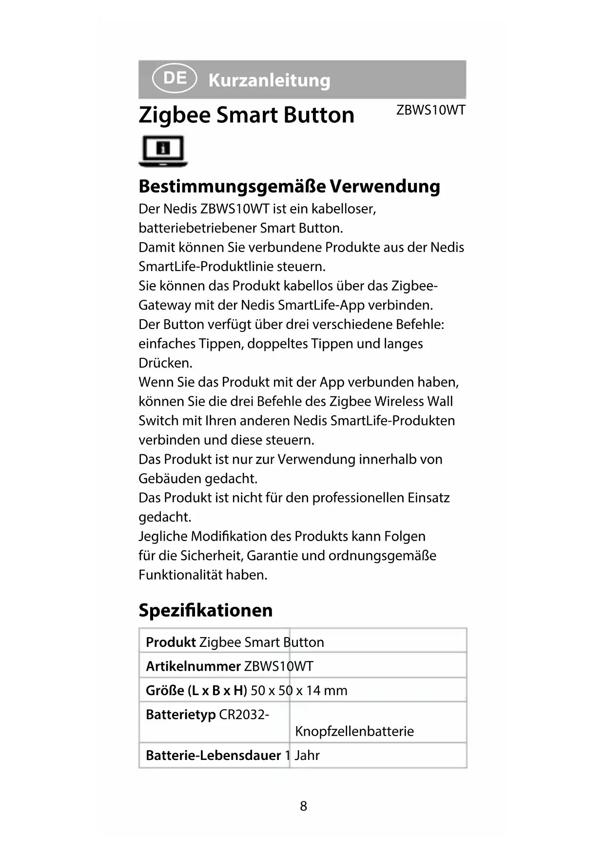 Kurzanleitung Zigbee Smart Button ZBWS10WT Bestimmungsgemäße Verwendung Der Nedis ZBWS10WT ist ein kabelloser, batteriebetriebener Smart Button.Damit können Sie verbundene Produkte aus der Nedis SmartLife-Produktlinie steuern.Sie können das Produkt kabellos über das Zigbee-Gateway mit der Nedis SmartLife-App verbinden.Der Button verfügt über drei verschiedene Befehle: einfaches Tippen, doppeltes Tippen und langes Drücken.Wenn Sie das Produkt mit der App verbunden haben, können Sie die drei Befehle des Zigbee Wireless Wall Switch mit Ihren anderen Nedis SmartLife-Produkten verbinden und diese steuern.Das Produkt ist nur zur Verwendung innerhalb von Gebäuden gedacht.Das Produkt ist nicht für den professionellen Einsatz gedacht.Jegliche Modikation des Produkts kann Folgen für die Sicherheit, Garantie und ordnungsgemäße Funktionalität haben. Spezikationen Produkt Zigbee Smart ButtonArtikelnummer ZBWS10WTGröße (L x B x H) 50 x 50 x 14 mmBatterietyp CR2032-KnopfzellenbatterieBatterie-Lebensdauer 1JahrBefehle Einfaches Tippen/doppeltes Tippen/langes DrückenTemperaturbereich -10 °C - +50 °CBetriebsfeuchtigkeit Maximum 95 % rel. Feuchte Hauptbestandteile (Abbildung A) 1 Schraube 2 Batterieabdeckung 3 LED-Licht 4 Reset-Taste Sicherheitshinweise
