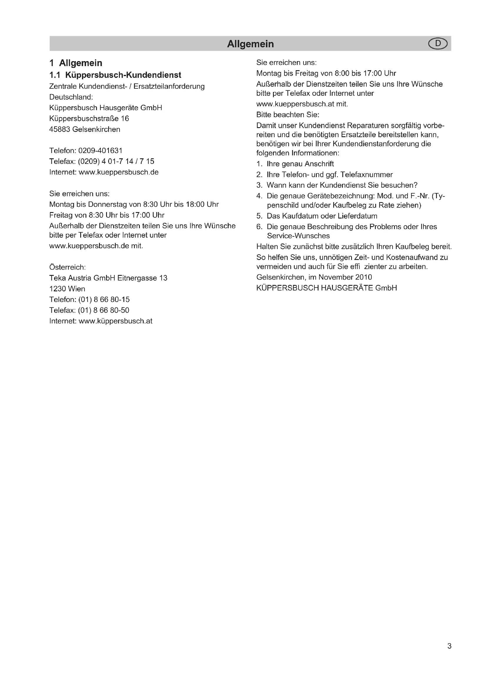 Service-Wunsches Halten Sie zunächst bitte zusätzlich Ihren Kaufbeleg bereit. So helfen Sie uns, unnötigen Zeit- und Kostenaufwand zu vermeiden und auch für Sie effi zienter zu arbeiten. Gelsenkirchen, im November 2010 KÜPPERSBUSCH HAUSGERÄTE GmbHAllgemein