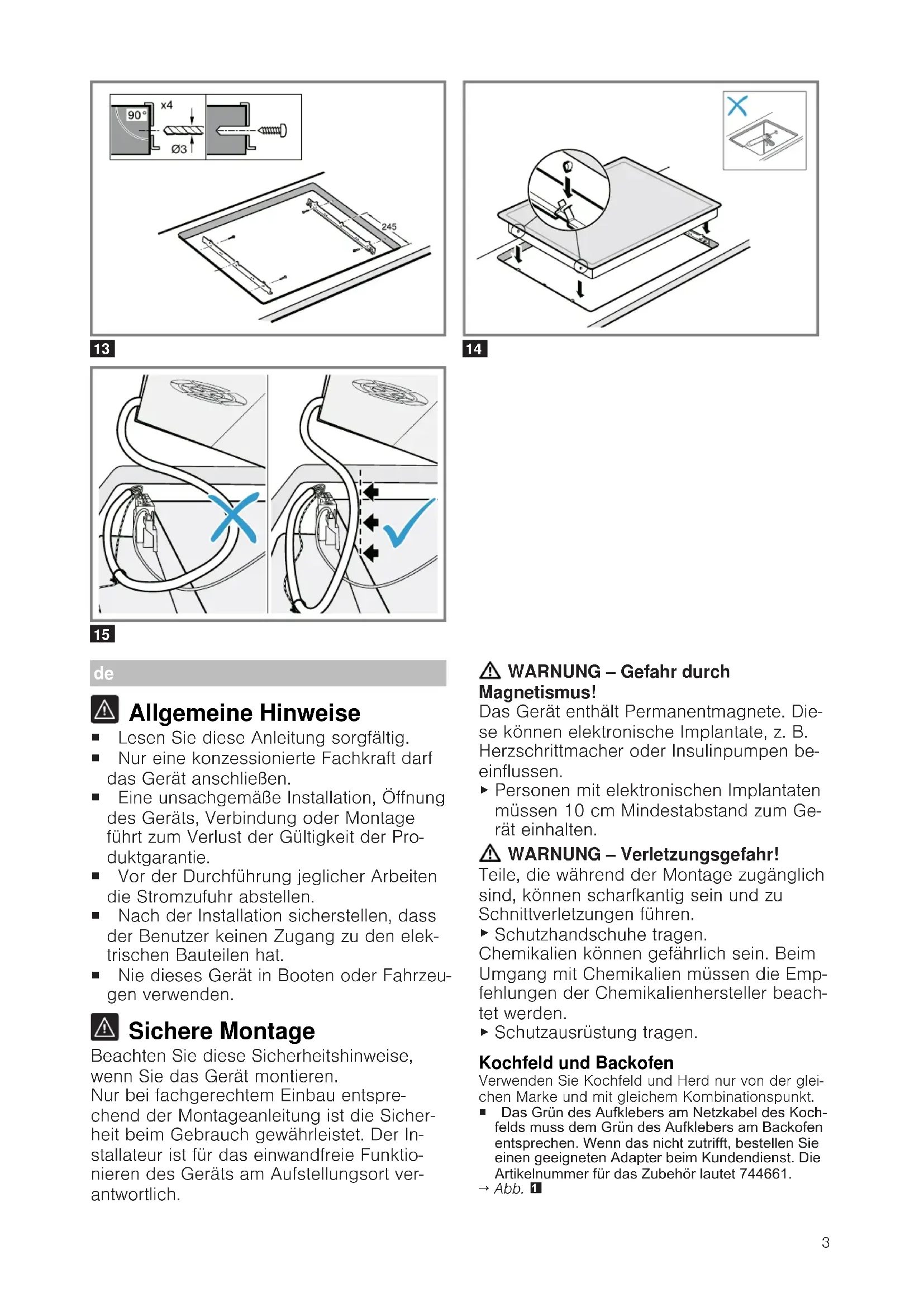 Personen mit elektronischen Implantaten müssen 10cm Mindestabstand zum Ge- rät einhalten. WARNUNG‒Verletzungsgefahr! Teile, die während der Montage zugänglich sind, können scharfkantig sein und zu Schnittverletzungen führen.