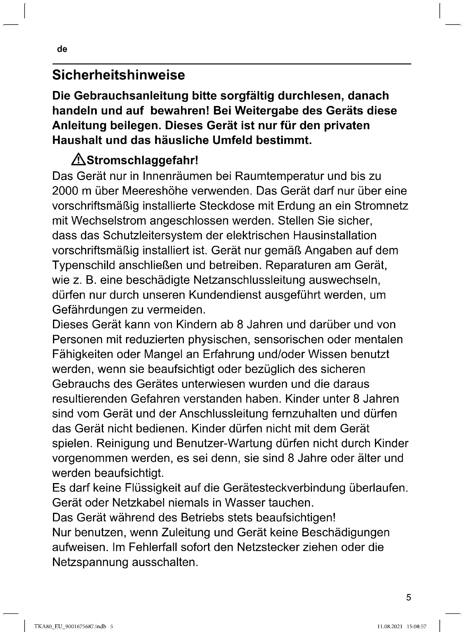 Dieses Gerät kann von Kindern ab 8 Jahren und darüber und von Personen mit reduzierten physischen, sensorischen oder mentalen Fähigkeiten oder Mangel an Erfahrung und/oder Wissen benutzt werden, wenn sie beaufsichtigt oder bezüglich des sicheren Gebrauchs des Gerätes unterwiesen wurden und die daraus resultierenden Gefahren verstanden haben. Kinder unter 8 Jahren sind vom Gerät und der Anschlussleitung fernzuhalten und dürfen das Gerät nicht bedieren. Kinder dürfen nicht mit dem Gerät speilen. Reinigung und Benutzer-Wartung dürfen nicht durch Kinder vorgenommen werden, es sei dess, sie sind 8 Jahre oder Alter und werden beaufsichtigt.