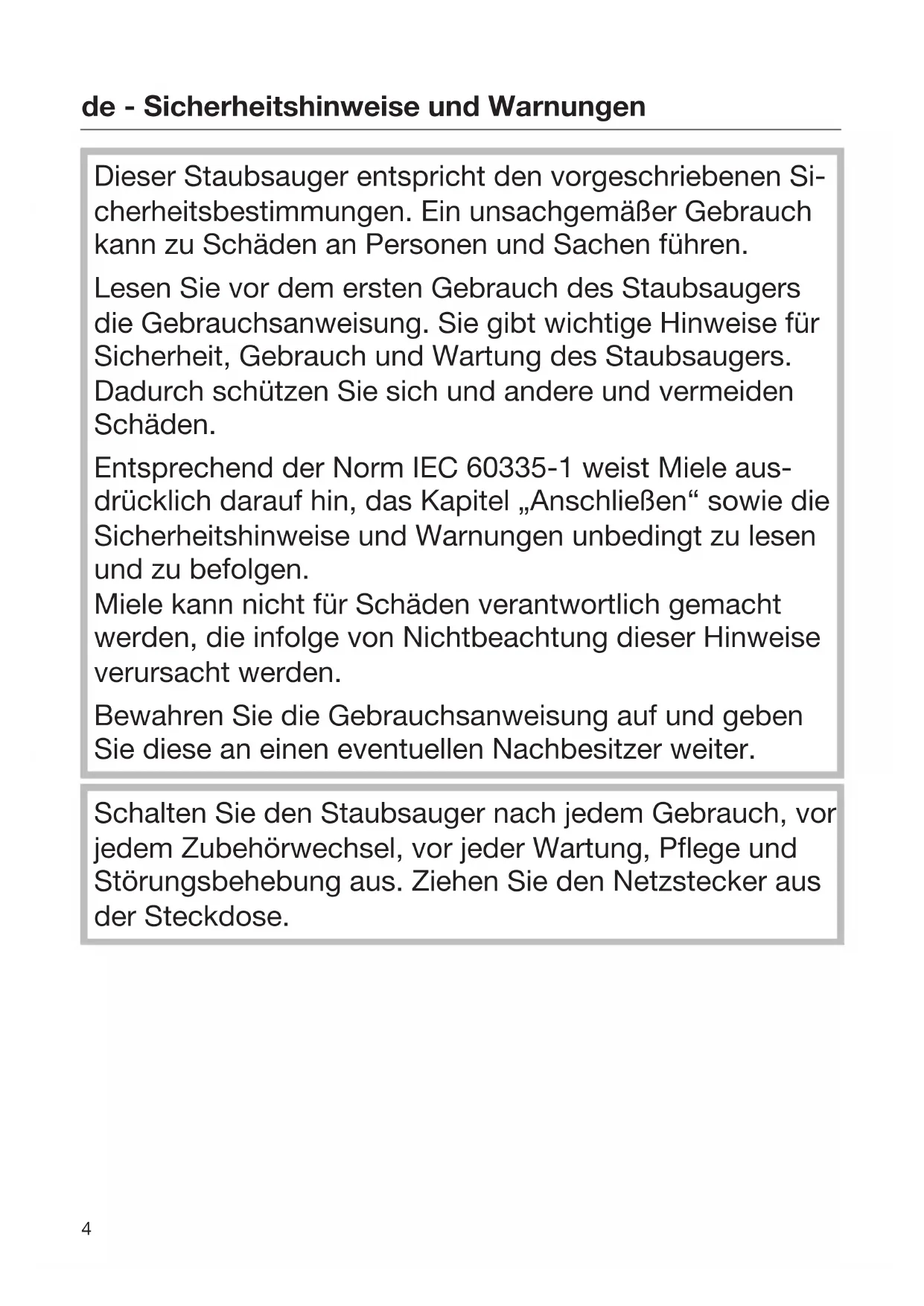 Dieser Staubsauger entspricht den vorgeschriebenen Si- cherheitsbestimmungen. Ein unsachgemäßer Gebrauch kann zu Schäden an Personen und Sachen führen. Lesen Sie vor dem ersten Gebrauch des Staubsaugers die Gebrauchsanweisung. Sie gibt wichtige Hinweise für Sicherheit, Gebrauch und Wartung des Staubsaugers. Dadurch schützen Sie sich und andere und vermeiden Schäden. Entsprechend der Norm IEC 60335-1 weist Miele aus- drücklich darauf hin, das Kapitel „Anschließen“ sowie die Sicherheitshinweise und Warnungen unbedingt zu lesen und zu befolgen. Miele kann nicht für Schäden verantwortlich gemacht werden, die infolge von Nichtbeachtung dieser Hinweise verursacht werden. Bewahren Sie die Gebrauchsanweisung auf und geben Sie diese an einen eventuellen Nachbesitzer weiter. Schalten Sie den Staubsauger nach jedem Gebrauch, vor jedem Zubehörwechsel, vor jeder Wartung, Pflege und Störungsbehebung aus. Ziehen Sie den Netzstecker aus der Steckdose.de - Sicherheitshinweise und Warnungen