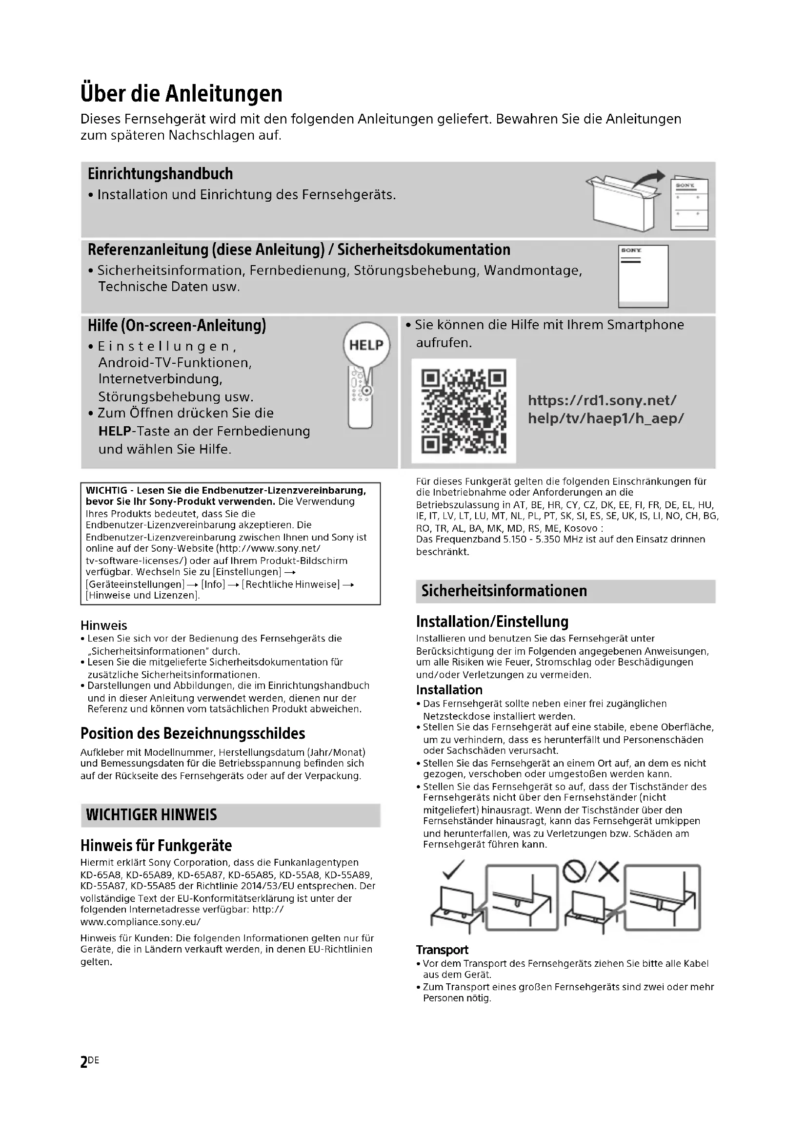 Hiermit erklart Sony Corporation, dass die Funkanlagenotypen KD-65A8K, KD-65A89KD-65A87KD-65A85KD-55A8KD-55A87KD-55A85 der Richtlinie 2014/53/EU entsprechen. Der vollständige Text der EU-Konformitätserklung ist unter der folgenden Internetadresse verfügbar: http:// www.compliance.sony.eu/