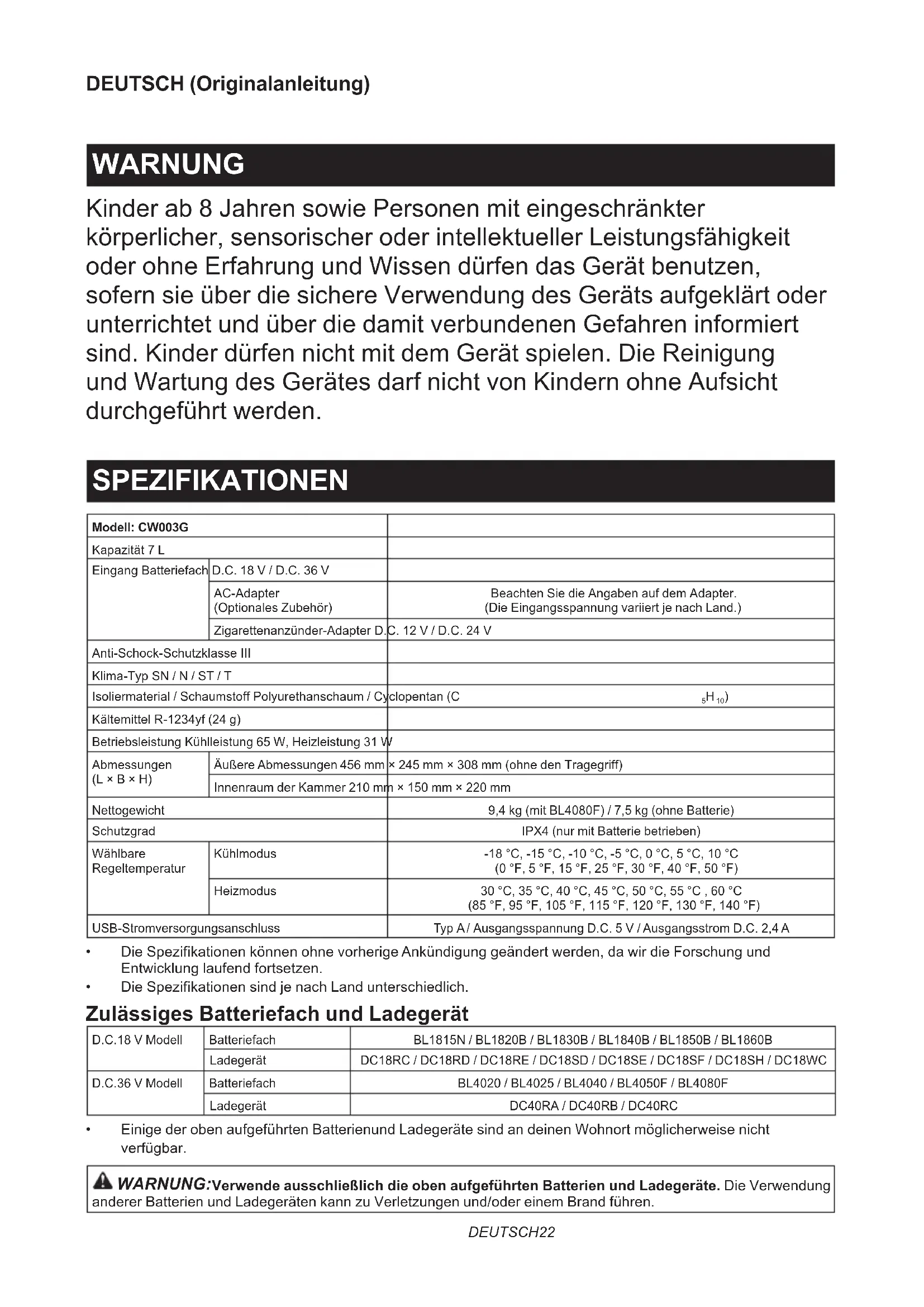 - Batterie et chargeur Makita d’origine REMARQUE : Certains articles de la liste peuvent être inclus dans la trousse de l’outil comme acces- soires standard. Ils peuvent varier d’un pays à l’autre.DEUTSCH22 DEUTSCH (Originalanleitung) WARNUNG Kinder ab 8 Jahren sowie Personen mit eingeschränkter körperlicher, sensorischer oder intellektueller Leistungsfähigkeit oder ohne Erfahrung und Wissen dürfen das Gerät benutzen, sofern sie über die sichere Verwendung des Geräts aufgeklärt oder unterrichtet und über die damit verbundenen Gefahren informiert sind. Kinder dürfen nicht mit dem Gerät spielen. Die Reinigung und Wartung des Gerätes darf nicht von Kindern ohne Aufsicht durchgeführt werden. SPEZIFIKATIONEN Modell: CW003GKapazität 7 LEingang Batteriefach D.C. 18 V / D.C. 36 VAC-Adapter (Optionales Zubehör)Beachten Sie die Angaben auf dem Adapter. (Die Eingangsspannung variiert je nach Land.)Zigarettenanzünder-Adapter D.C. 12 V / D.C. 24 VAnti-Schock-Schutzklasse IIIKlima-Typ SN / N / ST / TIsoliermaterial / Schaumstoff Polyurethanschaum / Cyclopentan (C