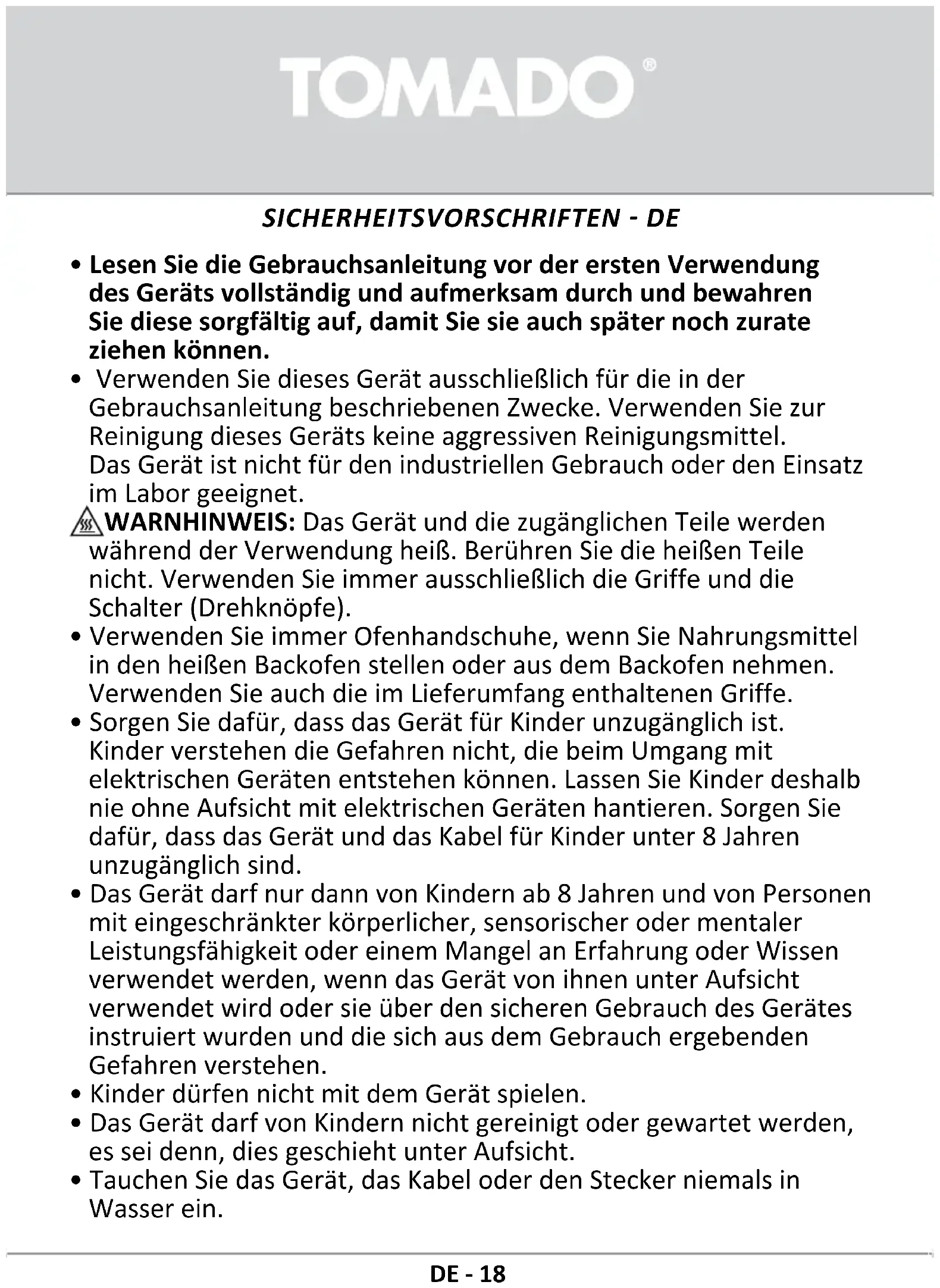 - Verwenden Sie das Gerät nur in Innenräumen und bewahren sie es nur dort auf. DE - 19• Der Backofen darf nicht mit einem Timer (einer Zeitschaltuhr) oder einer separaten Fernbedienung betrieben werden.