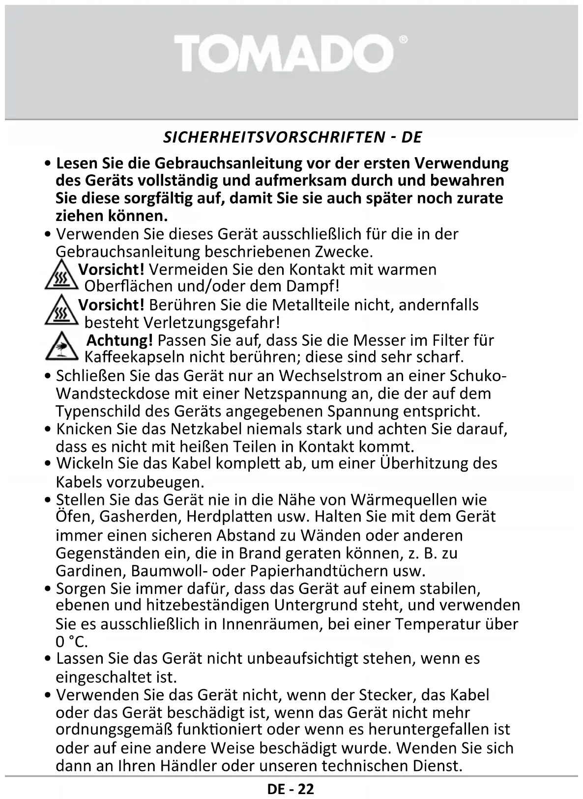 - Verwenden Sie dieses Gerät ausschließlich für die in der Gebrauchsanleitung beschriebenen Zwecke. Vorsicht! Vermeiden Sie den Kontakt mit warmen Oberächen und/oder dem Dampf! Vorsicht! Berühren Sie die Metallteile nicht, andernfalls besteht Verletzungsgefahr! Achtung! Passen Sie auf, dass Sie die Messer im Filter für Kaeekapseln nicht berühren; diese sind sehr scharf.