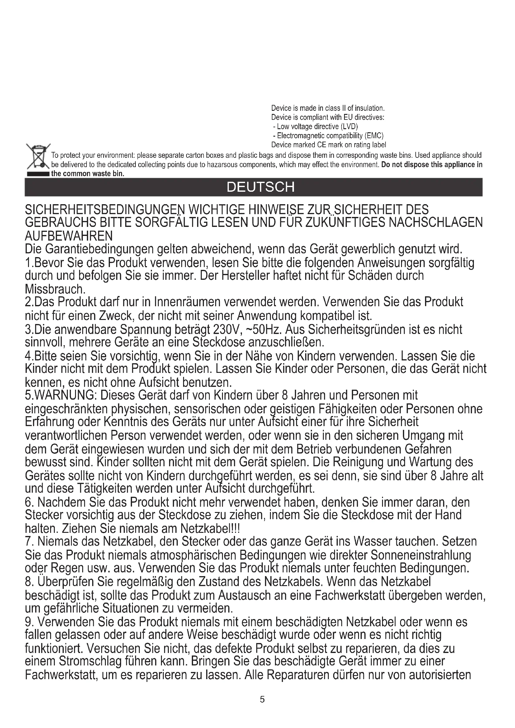 GEBRAUCHS BITTE SORGFÄLTIG LESEN UND FÜR ZUKÜNFTIGES NACHSCHLAGEN AUFBEWAHREN DEUTSCH DEUTSCH To protect your environment: please separate carton boxes and plastic bags and dispose them in corresponding waste bins. Used appliance should be delivered to the dedicated collecting points due to hazarsous components, which may effect the environment. Do not dispose this appliance in the common waste bin. Device is made in class II of insulation. Device is compliant with EU directives: - Low voltage directive (LVD) - Electromagnetic compatibility (EMC) Device marked CE mark on rating label6