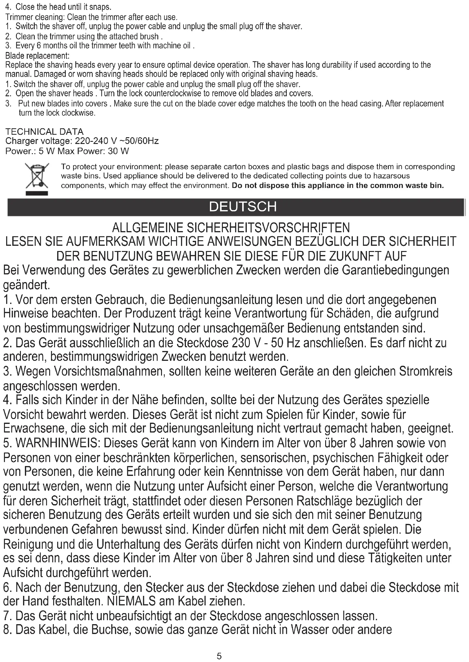 spezialisierten Service ausgetauscht werden, um ev. Gefährdung zu vermeiden. Das Gerät vor Regen, Sonne usw. und vor Feuchtigkeit (z.B. im Badezimmer oder Campingwagen) schützen. Flüssigkeiten tauchen. Das Gerät vor Regen, Sonne usw. und vor Feuchtigkeit (z.B. im Badezimmer oder Campingwagen) schützen.7 Leistung .: 5 W Max Leistung: 30 W Ladegerät Spannung: 220-240 V ~ 50 / 60Hz TECHNISCHE DATEN Setzen Sie neue Klingen in Abdeckungen 3.. Stellen Sie sicher, dass der Schnitt an der Messerabdeckung Kante entspricht den Zahn auf dem Kopfgehäuse. Nach dem Austausch drehen Sie die Verriegelung im Uhrzeigersinn. 2. Öffnen Sie die Scherköpfe. Drehen Sie die Verriegelung gegen den Uhrzeigersinn, um alte Blätter und Abdeckungen zu entfernen.