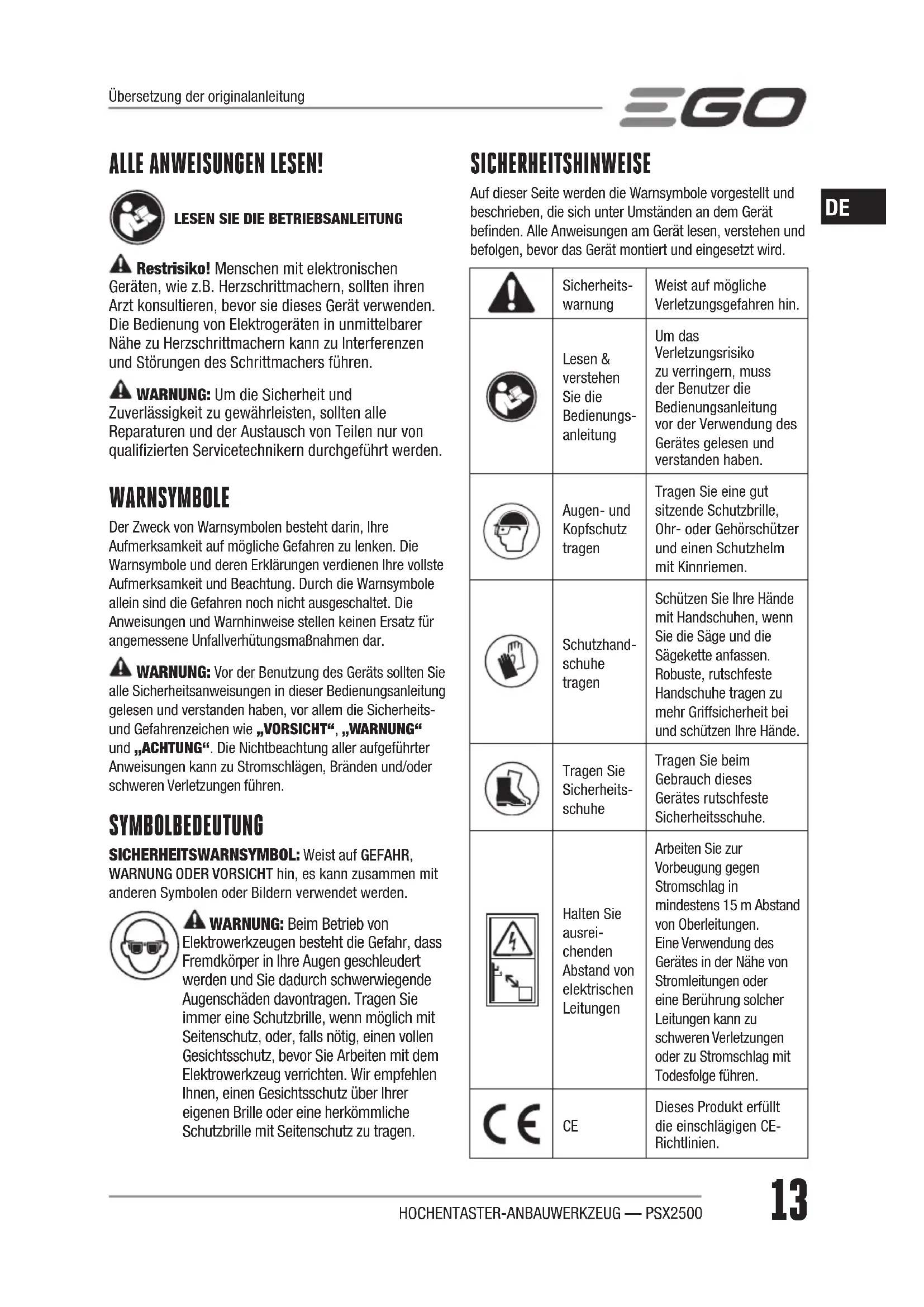 Leerlauf-drehzahlDrehzahl im Leerlauf... /min pro Minute Umdrehungen pro MinuteGleichstromArt oder Eigenschaft der StromzufuhrWICHTIGE SICHERHEITSHINWEISE WARNUNG! Beim Gebrauch elektrischer Gartengeräte sollten stets grundlegende Sicherheitsvorkehrungen beachtet werden, um Verletzungs-, Brand- und Stromschlaggefahren einzudämmen. Dazu gehören folgende Maßnahmen:VOR DER BENUTZUNG SORGFÄLTIG LESENZUM SPÄTEREN NACHSCHLAGEN AUFBEWAHREN VORSICHT! Nicht in der Nähe von Stromleitungen arbeiten. Das Gerät ist nicht so ausgelegt, dass es bei der Berührung von Stromleitungen vor einem Stromschlag schützen kann. Erkundigen Sie sich nach den örtlichen Bestimmungen für sichere Abstände von elektrischen Leitungen und stellen Sie sicher, dass Sie eine sichere Arbeitsposition eingenommen haben, bevor Sie das Gerät bedienen SICHERHEITSHINWEISE ZU HOCHENTASTERN ◾ Halten Sie alle Körperteile von der Sägekette fern, wenn der Hochentaster in Betrieb ist. Bevor Sie den Hochentaster starten, vergewissern Sie sich, dass die Sägekette nichts berührt. Ein Augenblick der Unaufmerksamkeit beim Betrieb eines Hochentasters kann dazu führen, dass Ihre Kleidung oder Ihr Körper von der Kette erfasst wird. ◾ Vermeiden Sie die unabsichtliche Berührung der still stehenden Sägekette oder der Führungsschienenstege. Diese können sehr scharf sein. Tragen Sie bei der Handhabung des Hochentasters, der Sägekette oder der Führungsschiene immer Handschuhe und eine lange Hose oder Beinschützer. ◾ Halten Sie den Hochentaster immer mit einer Hand am hinteren Griff und und mit der anderen Hand am vorderen Haltegriff. Durch die Bedienung mit nur einer Hand können Benutzer, Helfer und/oder Umstehende schwer verletzt werden. ◾ Halten Sie das Elektrowerkzeug nur an den isolierten Griffflächen fest, da die Sägekette versteckte Kabel berühren könnte. Trifft die Kettensäge auf ein Strom führendes Kabel, besteht die Gefahr, dass die blanken Metallteile des Elektrowerk zeugs ebenfalls Strom führen, sodass für den Bediener Stromschlaggefahr besteht. ◾ Tragen Sie eine Schutzbrille und einen Gehörschutz. Weitere Schutzausrüstung für Kopf, Hände, Beine und Füße wird empfohlen. Angemessene Schutzkleidung reduziert mögliche Verletzungen durch umhergeschleuderte Fremdkörper oder durch einen versehentlichen Kontakt mit der Sägekette. ◾ Den Hochentaster nicht auf einem Baum stehend einsetzen. Bei Benutzung des Hochentasters auf einem Baum besteht Verletzungsgefahr. ◾ Immer auf festen Stand achten und den Hochentaster nur auf festem, sicherem und ebenem Untergrund einsetzen. Rutschige oder wackelige Flächen wie zum Beispiel Leitern können zum Verlust des Gleichgewichts oder der Kontrolle über den Hochentaster führen. ◾ Benutzen Sie niemals einen Hochentaster, der beschädigt oder fehlerhaft eingestellt oder nicht komplett und sicher zusammengebaut ist. Die Sägekette muss ihre Bewegung einstellen, wenn Sie den Auslöser loslassen. ◾ Untersuchen Sie das Werkstück auf Nägel, Drähte oder andere Fremdkörper, bevor Sie es sägen. ◾ Wenn Sie einen Ast durchtrennen, der unter Spannung steht, müssen Sie auf eventuelle Rückfederkräfte gefasst sein. Wenn die Spannung in den Holzfasern freigesetzt wird, kann der unter Spannung stehende Ast zurückfedern und den Benutzer treffen und/oder der Hochentaster kann außer Kontrolle geraten. ◾ Seien Sie besonders vorsichtig beim Schneiden von Buschwerk und jungen Trieben. Das dünne Schnittgut kann von der Sägekette erfasst werden und in Ihre Richtung geschleudert werden oder Sie aus dem Gleichgewicht bringen.15 HOCHENTASTER-ANBAUWERKZEUG — PSX2500
