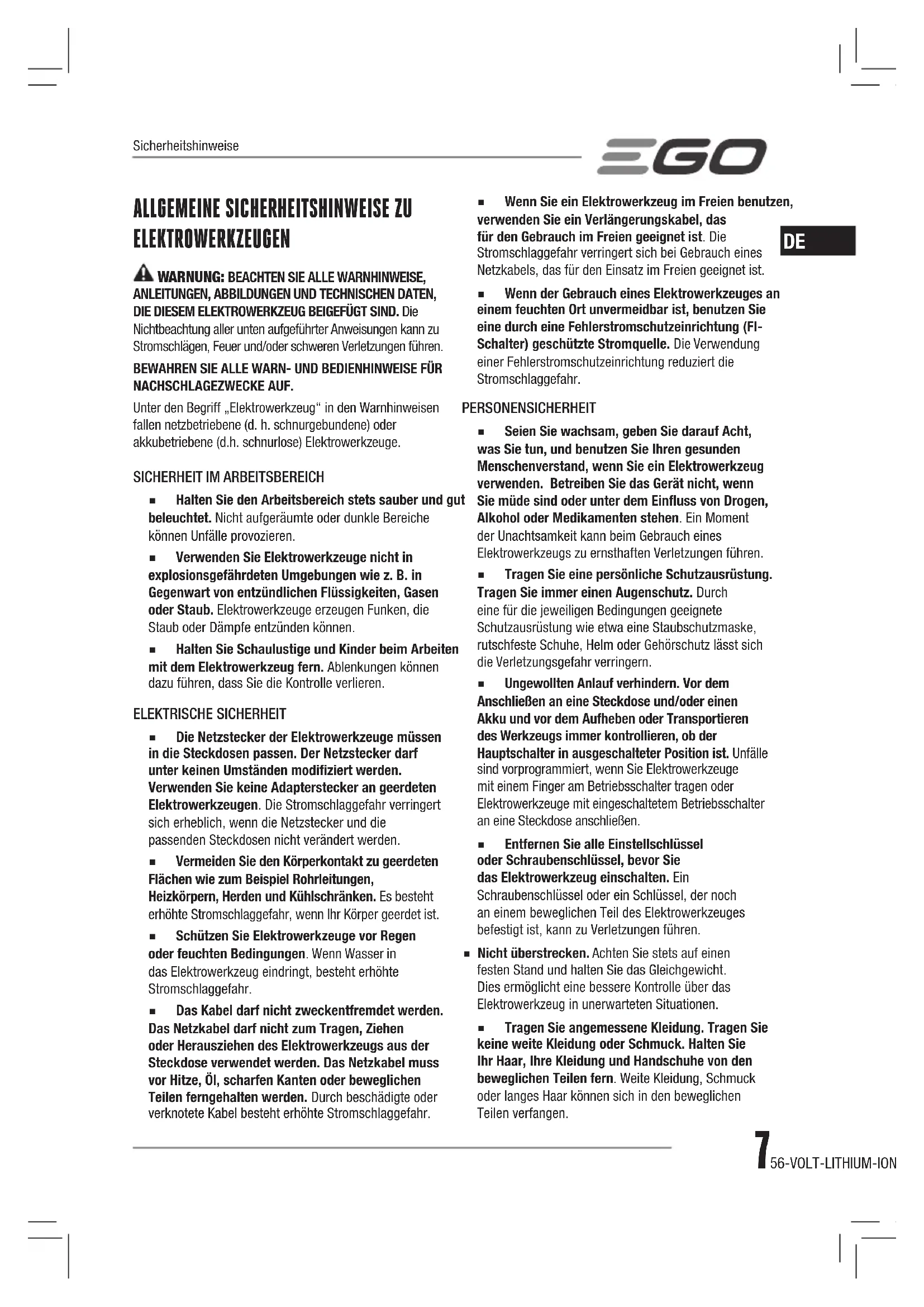 ◾ Halten Sie den Arbeitsbereich stets sauber und gut beleuchtet. Nicht aufgeräumte oder dunkle Bereiche können Unfälle provozieren. ◾ Verwenden Sie Elektrowerkzeuge nicht in explosionsgefährdeten Umgebungen wie z. B. in Gegenwart von entzündlichen Flüssigkeiten, Gasen oder Staub. Elektrowerkzeuge erzeugen Funken, die Staub oder Dämpfe entzünden können. ◾ Halten Sie Schaulustige und Kinder beim Arbeiten mit dem Elektrowerkzeug fern. Ablenkungen können dazu führen, dass Sie die Kontrolle verlieren. ELEKTRISCHE SICHERHEIT ◾ Die Netzstecker der Elektrowerkzeuge müssen in die Steckdosen passen. Der Netzstecker darf unter keinen Umständen modiziert werden. Verwenden Sie keine Adapterstecker an geerdeten Elektrowerkzeugen. Die Stromschlaggefahr verringert sich erheblich, wenn die Netzstecker und die passenden Steckdosen nicht verändert werden. ◾ Vermeiden Sie den Körperkontakt zu geerdeten Flächen wie zum Beispiel Rohrleitungen, Heizkörpern, Herden und Kühlschränken. Es besteht erhöhte Stromschlaggefahr, wenn Ihr Körper geerdet ist. ◾ Schützen Sie Elektrowerkzeuge vor Regen oder feuchten Bedingungen. Wenn Wasser in das Elektrowerkzeug eindringt, besteht erhöhte Stromschlaggefahr. ◾ Das Kabel darf nicht zweckentfremdet werden. Das Netzkabel darf nicht zum Tragen, Ziehen oder Herausziehen des Elektrowerkzeugs aus der Steckdose verwendet werden. Das Netzkabel muss vor Hitze, Öl, scharfen Kanten oder beweglichen Teilen ferngehalten werden. Durch beschädigte oder verknotete Kabel besteht erhöhte Stromschlaggefahr. ◾ Wenn Sie ein Elektrowerkzeug im Freien benutzen, verwenden Sie ein Verlängerungskabel, das für den Gebrauch im Freien geeignet ist. Die Stromschlaggefahr verringert sich bei Gebrauch eines Netzkabels, das für den Einsatz im Freien geeignet ist. ◾ Wenn der Gebrauch eines Elektrowerkzeuges an einem feuchten Ort unvermeidbar ist, benutzen Sie eine durch eine Fehlerstromschutzeinrichtung (FI-Schalter) geschützte Stromquelle. Die Verwendung einer Fehlerstromschutzeinrichtung reduziert die Stromschlaggefahr. PERSONENSICHERHEIT ◾ Seien Sie wachsam, geben Sie darauf Acht, was Sie tun, und benutzen Sie Ihren gesunden Menschenverstand, wenn Sie ein Elektrowerkzeug verwenden. Betreiben Sie das Gerät nicht, wenn Sie müde sind oder unter dem Einuss von Drogen, Alkohol oder Medikamenten stehen. Ein Moment der Unachtsamkeit kann beim Gebrauch eines Elektrowerkzeugs zu ernsthaften Verletzungen führen. ◾ Tragen Sie eine persönliche Schutzausrüstung. Tragen Sie immer einen Augenschutz. Durch eine für die jeweiligen Bedingungen geeignete Schutzausrüstung wie etwa eine Staubschutzmaske, rutschfeste Schuhe, Helm oder Gehörschutz lässt sich die Verletzungsgefahr verringern. ◾ Ungewollten Anlauf verhindern. Vor dem Anschließen an eine Steckdose und/oder einen Akku und vor dem Aufheben oder Transportieren des Werkzeugs immer kontrollieren, ob der Hauptschalter in ausgeschalteter Position ist. Unfälle sind vorprogrammiert, wenn Sie Elektrowerkzeuge mit einem Finger am Betriebsschalter tragen oder Elektrowerkzeuge mit eingeschaltetem Betriebsschalter an eine Steckdose anschließen. ◾ Entfernen Sie alle Einstellschlüssel oder Schraubenschlüssel, bevor Sie das Elektrowerkzeug einschalten. Ein Schraubenschlüssel oder ein Schlüssel, der noch an einem beweglichen Teil des Elektrowerkzeuges befestigt ist, kann zu Verletzungen führen. ◾ Nicht überstrecken. Achten Sie stets auf einen festen Stand und halten Sie das Gleichgewicht. Dies ermöglicht eine bessere Kontrolle über das Elektrowerkzeug in unerwarteten Situationen. ◾ Tragen Sie angemessene Kleidung. Tragen Sie keine weite Kleidung oder Schmuck. Halten Sie Ihr Haar, Ihre Kleidung und Handschuhe von den beweglichen Teilen fern. Weite Kleidung, Schmuck oder langes Haar können sich in den beweglichen Teilen verfangen.Sicherheitshinweise8 56-VOLT-LITHIUM-IONEN-AKKU-RASENMÄHER
