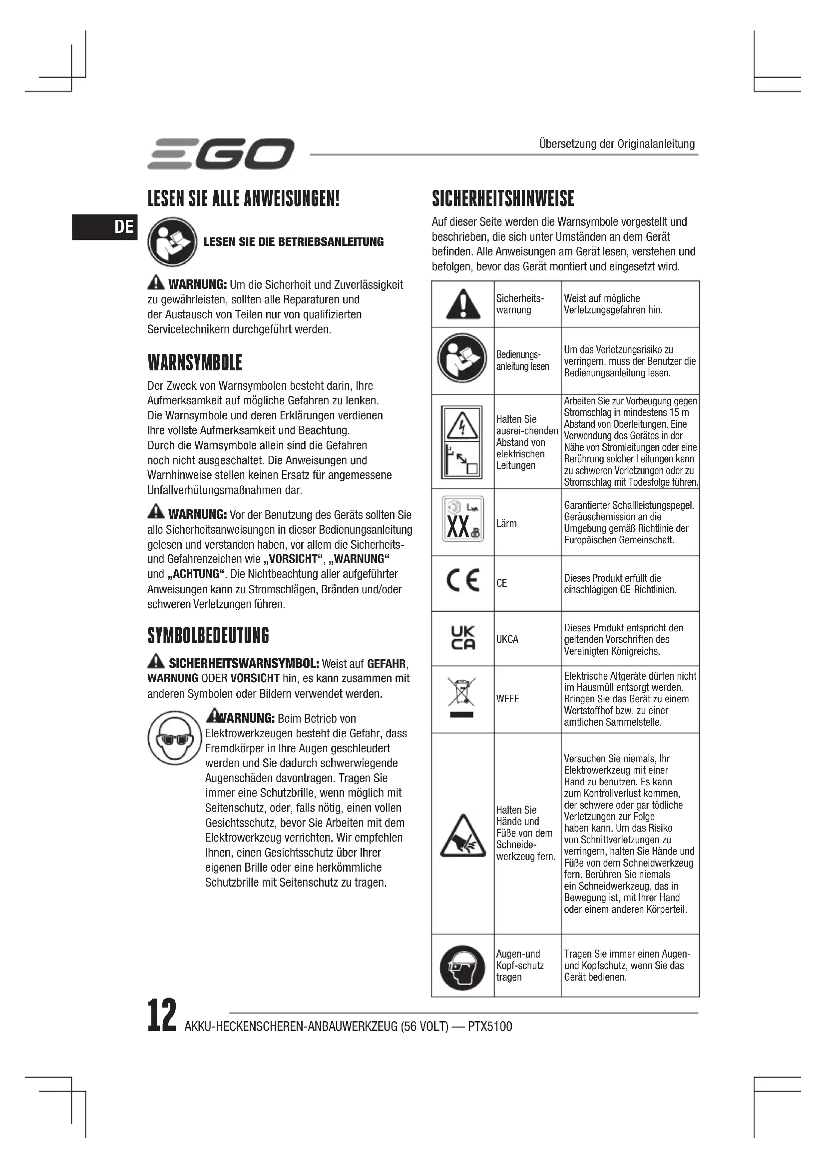 BEDIENUNGSANLEITUNG PTX5100 EGO