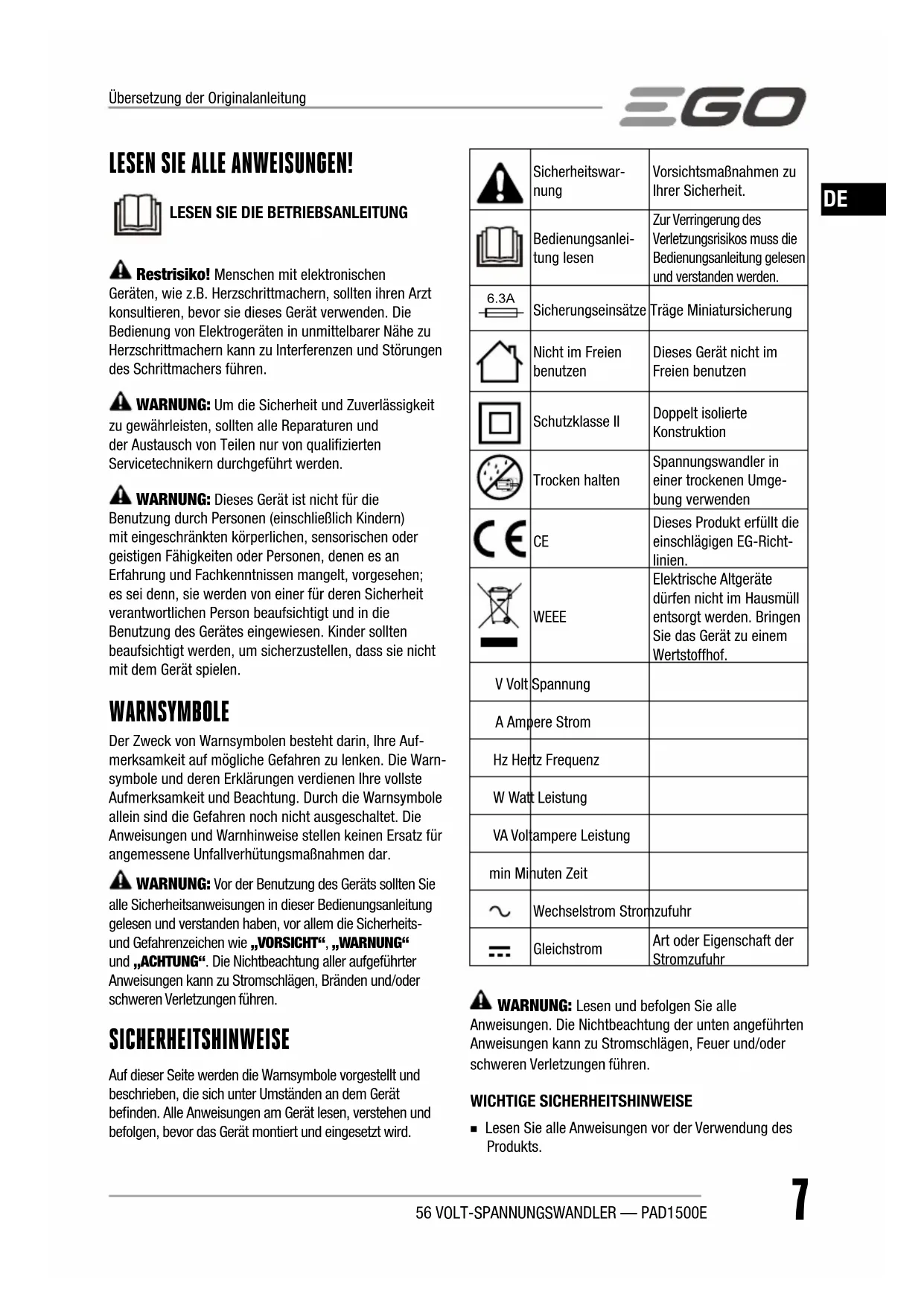 Restrisiko! Menschen mit elektronischen Geräten, wie z.B. Herzschrittmachern, sollten ihren Arzt konsultieren, bevor sie dieses Gerät verwenden. Die Bedienung von Elektrogeräten in unmittelbarer Nähe zu Herzschrittmachern kann zu Interferenzen und Störungen des Schrittmachers führen. WARNUNG: Um die Sicherheit und Zuverlässigkeit zu gewährleisten, sollten alle Reparaturen und der Austausch von Teilen nur von qualifizierten Servicetechnikern durchgeführt werden. WARNUNG: Dieses Gerät ist nicht für die Benutzung durch Personen (einschließlich Kindern) mit eingeschränkten körperlichen, sensorischen oder geistigen Fähigkeiten oder Personen, denen es an Erfahrung und Fachkenntnissen mangelt, vorgesehen; es sei denn, sie werden von einer für deren Sicherheit verantwortlichen Person beaufsichtigt und in die Benutzung des Gerätes eingewiesen. Kinder sollten beaufsichtigt werden, um sicherzustellen, dass sie nicht mit dem Gerät spielen. WARNSYMBOLE Der Zweck von Warnsymbolen besteht darin, Ihre Auf-merksamkeit auf mögliche Gefahren zu lenken. Die Warn-symbole und deren Erklärungen verdienen Ihre vollste Aufmerksamkeit und Beachtung. Durch die Warnsymbole allein sind die Gefahren noch nicht ausgeschaltet. Die Anweisungen und Warnhinweise stellen keinen Ersatz für angemessene Unfallverhütungsmaßnahmen dar. WARNUNG: Vor der Benutzung des Geräts sollten Sie alle Sicherheitsanweisungen in dieser Bedienungsanleitung gelesen und verstanden haben, vor allem die Sicherheits- und Gefahrenzeichen wie „VORSICHT“, „WARNUNG“ und „ACHTUNG“. Die Nichtbeachtung aller aufgeführter Anweisungen kann zu Stromschlägen, Bränden und/oder schweren Verletzungen führen. SICHERHEITSHINWEISE Auf dieser Seite werden die Warnsymbole vorgestellt und beschrieben, die sich unter Umständen an dem Gerät befinden. Alle Anweisungen am Gerät lesen, verstehen und befolgen, bevor das Gerät montiert und eingesetzt wird.Sicherheitswar- nung Vorsichtsmaßnahmen zu Ihrer Sicherheit.Bedienungsanlei-tung lesenZur Verringerung des Verletzungsrisikos muss die Bedienungsanleitung gelesen und verstanden werden. 6.3A Sicherungseinsätze Träge MiniatursicherungNicht im Freien benutzenDieses Gerät nicht im Freien benutzenSchutzklasse IIDoppelt isolierte KonstruktionTrocken haltenSpannungswandler in einer trockenen Umge-bung verwenden Dieses Produkt erfüllt die einschlägigen EG-Richt-linien. WEEE Elektrische Altgeräte dürfen nicht im Hausmüll entsorgt werden. Bringen Sie das Gerät zu einem Wertstoffhof.V Volt SpannungA Ampere StromHz Hertz FrequenzW Watt LeistungVA Voltampere Leistungmin Minuten ZeitWechselstrom StromzufuhrGleichstromArt oder Eigenschaft der Stromzufuhr WARNUNG: Lesen und befolgen Sie alle Anweisungen. Die Nichtbeachtung der unten angeführten Anweisungen kann zu Stromschlägen, Feuer und/oder schweren Verletzungen führen. WICHTIGE SICHERHEITSHINWEISE ◾ Lesen Sie alle Anweisungen vor der Verwendung des Produkts.Übersetzung der Originalanleitung8 56 VOLT-SPANNUNGSWANDLER — PAD1500E