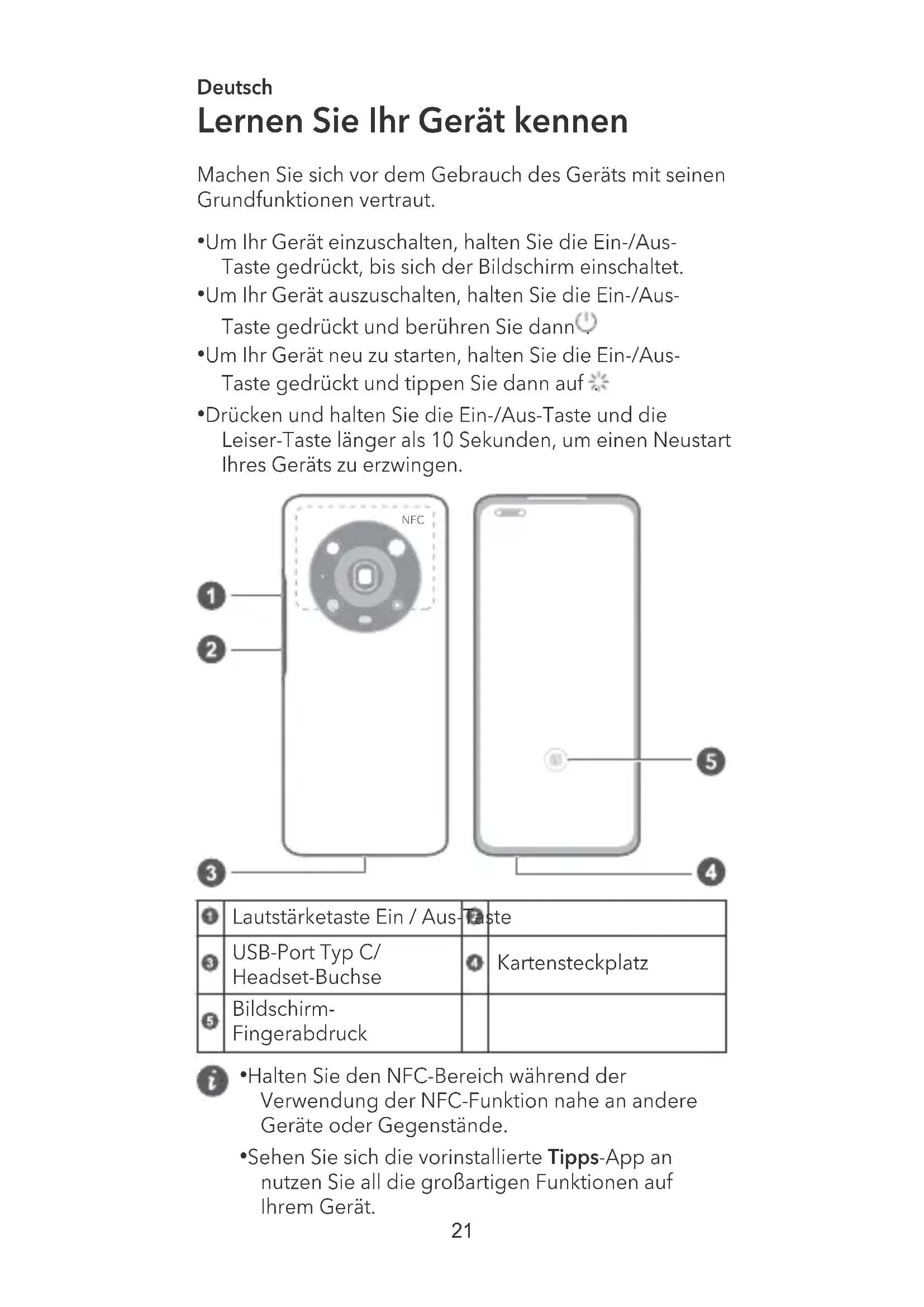 - Sehen Sie sich die vorinstallierte Tipps-App an nutzen Sie all die großartigen Funktionen auf Ihrem Gerät. 21Erste Schritte
