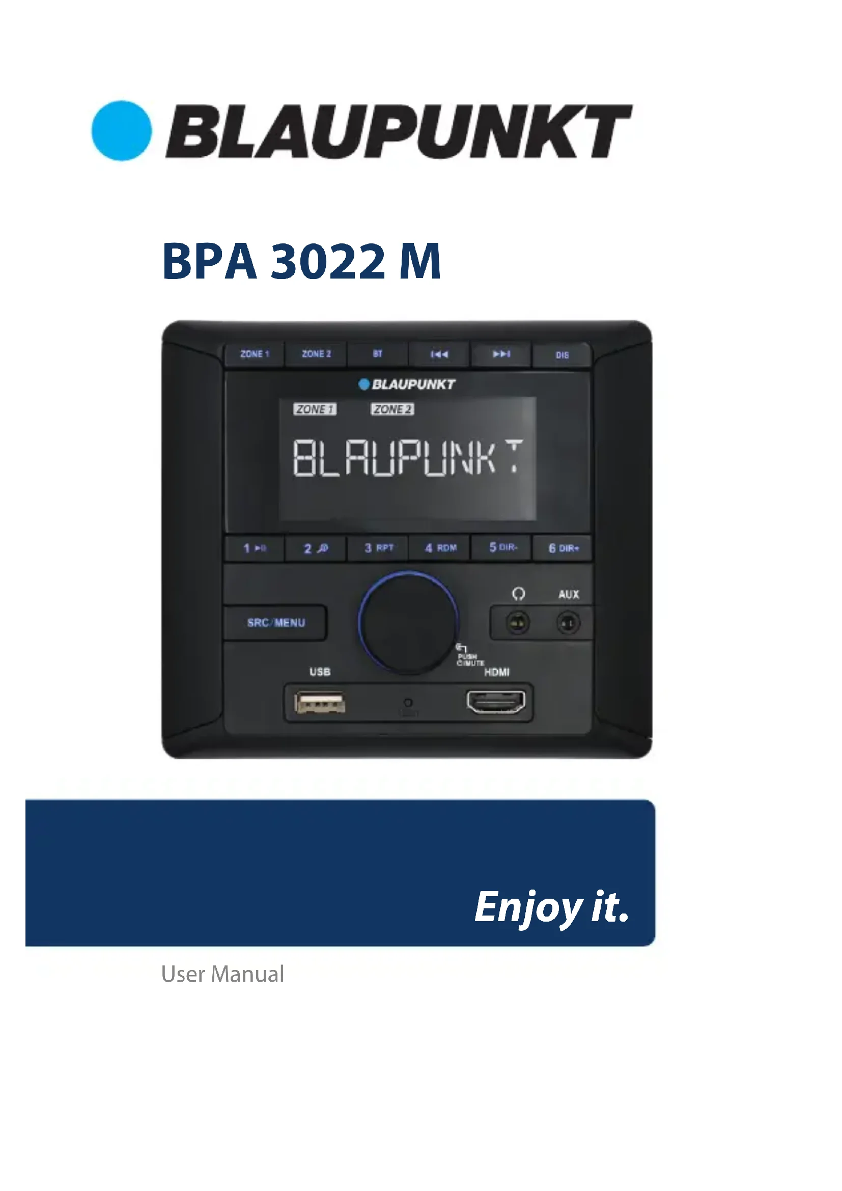 Halten Sie die Taste Zone 1 (oder Zone 2) gedrückt, um den Ton von Zone 1 (oder Zone 2) stummzuschalten. Drücken Sie die Taste erneut, um die Stummschaltung aufzuheben.Priorität einstellen: Informationen oder UhrzeitDrücken Sie kurz die Taste DIS, um die Priorität der Uhrzeit oder der Informationen einzustellen. Hinweis: Wenn Sie im UKW-Band RDS-Sender empfangen, drücken Sie kurz die Taste DIS, um RADIOSENDER/ ZEIT/FREQUENZ anzuzeigen.Uhrzeit einstellenWählen Sie im Menü CLK HH/CLK MM. Drehen Sie den Drehknopf VOL, um die Stunde/Minute einzustellen.Kopfhörer bedienenAn der Vorderseite bendet sich eine 3,5-mm-Kopfhörerbuchse. Das System übernimmt für Kopfhörer die Betriebseinstellungen für Zone 1.RADIOBEDIENUNGRadiosender empfangenDrücken Sie die Taste SRC/MENU, um einen Modus aus FM1->FM2->MW auszuwählen. Drücken Sie kurz / , um den gewünschten Radiosender zu empfangen. Drücken und halten Sie / gedrückt, um die Frequenz manuell einzustellen.Radiosender manuell abspeichern und gespeicherte Radiosender abrufenEmpfangen des gewünschten Radiosenders. Drücken Sie eine der Speichertasten (1-6) und halten Sie sie 2 Sekunden lang gedrückt. Der aktuelle Radiosender wird im Speicher unter der entsprechenden Zierntaste abgelegt. Drücken Sie kurz auf die Taste des voreingestellten Radiosenders (1-6), um direkt das Sendesignal des unter der zugewiesenen Taste gespeicherten Senders zu hören.BEDIENDUNG VON DABDrücken Sie SRC/MENU, um die Quelle zwischen DAB1 und DAB2 umzuschalten.Radiosender auswählenDrücken Sie die Taste / , um den nächsten/vorherigen Radiosender auszuwählen.Radiosender manuell abspeichern und gespeicherte Radiosender abrufenWenn die Frequenz des gewünschten Radiosenders eingestellt ist. Drücken und halten Sie eine der Tasten 1 bis 6 2 Sekunden lang gedrückt, um diesen Sender unter der entsprechenden Nummer zu speichern. Drücken Sie kurz auf die Taste des voreingestellten Radiosenders (1-6), um direkt das Sendesignal des unter der zugewiesenen Taste gespeicherten Senders zu hören.UNTERSTÜTZUNG VON USB-SPEICHERNWenn ein USB-Speicher an das Gerät angeschlossen wird, spielt das Gerät automatisch MP3/WMA-Dateien ab. Wenn bereits ein USB-Speicher an das Gerät angeschlossen ist, drücken Sie kurz SRC/MENU, bis der USB-Modus-Bildschirm erscheint.Dateien auswählenDrücken Sie die Taste / , um zur nächsten/vorherigen Datei zu gelangen. Halten Sie die Taste / , um vor- oder zurückzuspulen.Wiedergabe/PauseDrücken Sie 1 , um die Datei anzuhalten/abzuspielen.SchleifenwiedergabeDrücken Sie die Taste 3 RPT, um die Schleifenwiedergabefunktion zu wählen. RPT ONE/RPT FOLD/RPT ALL (Standard)RPT ONE: Schleifenwiedergabe einer einzelnen Datei.RPT FOLD: Schleifenwiedergabe aller Dateien in einem Ordner.RPT ALL: Schleifenwiedergabe aller Dateien.RANDOMDrücken Sie die Taste 4 RDM, um die Zufallswiedergabefunktion ein- oder auszuschalten.RDM Ein Zufallswiedergabe aller Dateien.RDM Aus Deaktivieren der Zufallswiedergabefunktion.Ordnerfunktion +/-Drücken Sie DIR+/DIR-, um den nächsten/vorherigen Ordner für die Wiedergabe auszuwählen.Titel suchenDurch Drücken und Halten der Taste wird „NUM 0000“ angezeigt. Wählen Sie durch Drehen des Drehknopfes VOL (oder durch direkte Eingabe der Nummer) die Nummer aus und drücken Sie dann VOL zur Wiedergabe. Beachten Sie 7/8/9/0 als: BT = 7, = 8, = 9, DIS = 0.VERWENDUNG DER BUCHSE AUX IN 1/2Die Buchse AUX IN 1 an der Vorderseite ist 3,5-mm. Die Buchse AUX IN 2 für RCA bendet sich auf der Rückseite des Geräts. Durch Drücken der Taste SRC/MENU wird auf den Modus AUX IN1 (2) umgeschaltet, wenn das Audiosignal an das Gerät angeschlossen ist. BLUETOOTH-UNTERSTÜTZUNG Kopplung von GerätenWählen Sie auf Ihrem Smartphone Bluetooth und suchen Sie nach Ihrem Bluetooth-Gerät. In der Liste sollte „BLAUPUNKT“ erscheinen; wählen Sie „BLAUPUNKT“ und geben Sie das Passwort „0000“ ein, wenn Sie zur Eingabe eines Passworts aufgefordert werden. Nach erfolgreichem Koppeln wird BT auf dem Display angezeigt.Bluetooth-AudioDrücken Sie die Taste SRC/MENU, um in den BT MUSIC-Modus zu wechseln. Das Gerät spielt automatisch den Titel von Ihrem Handy ab. Drücken Sie die Taste , um den Titel anzuhalten/abzuspielen.Drücken Sie die Taste / , um den nächsten/vorherigen Titel zu wählen.HDMI-UNTERSTÜTZUNGDie vordere HDMI-Buchse wird mit der hinteren HDMI-Buchse verbunden. Dies hat keinen Einuss auf HDMI-Wiedergabe.Anschlüsse RCA V-IN und V-OUTAuf der Rückseite des Geräts ist der V-IN-Anschluss zum V-OUT-Anschluss geführt.FERNBEDIENUNGDie Fernbedienung kann verwendet werden,wenn im Menü die Option IR aktiviert ist.OFF: Gerät einschalten/ausschalten.VOL+: Lautstärke erhöhenVOL-: Lautstärke reduzieren 1 : Stummschaltung Zone 1 einschalten/ausschalten 2 : Stummschaltung Zone 2 einschalten/ausschaltenFür andere Aktionen lesen Sie bitte die obigen Anweisungen.ALLGEMEINE INFORMATIONENAnforderungen an die Stromversorgung : Gleichstrom 12 V, Minuspol mit Masse verbundenAbmessungen des Montagesockels : 129 (B) x 112 (T) x 65 (H)Klangeinstellungen- Tief (bei 100 Hz) : ±10 dB- Hoch (bei 100 Hz) : ±10 dBMax. Ausgangsleistung : 4 x 40 WStromaufnahme : 10 A (max.)