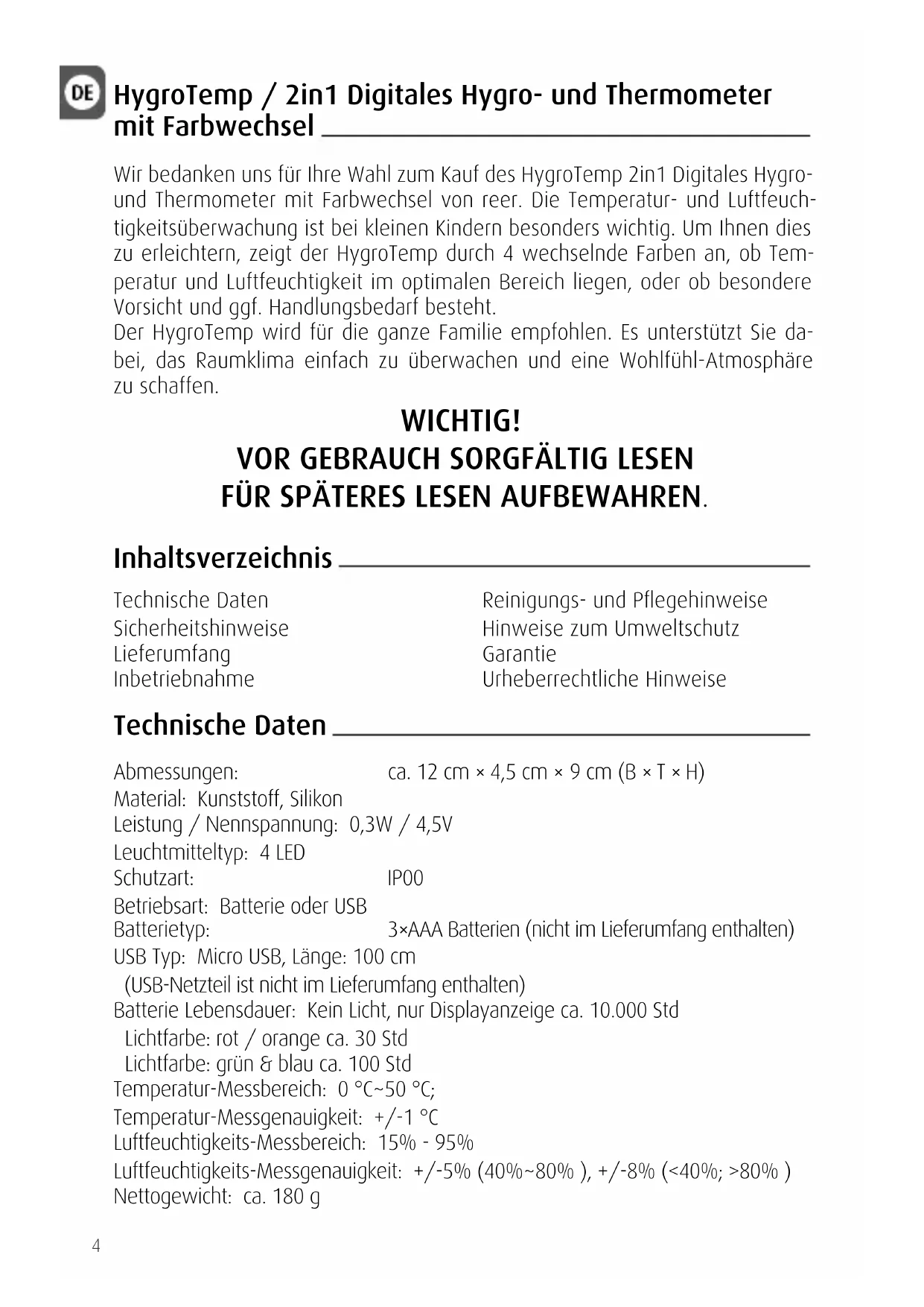 Wir bedanken uns für ihre Wahl zum Kauf des HygroTemp 2in1 Digitales Hyground Thermometer mit Farbwechsel von reer. Die Temperatur- und Luftfeuchtigkeitsüberwachung ist bei keinen Kindern entsprechenden wichtig. Um denen zu erreichtern, zeigt der HygroTemp durch 4 wechselnde Farben an, ob Temperatur und Luftfeuchtigkeit im optimalen Bereich liegen, oder ob besondere Vorsicht und ggf. Handlungsbedarf besteht.