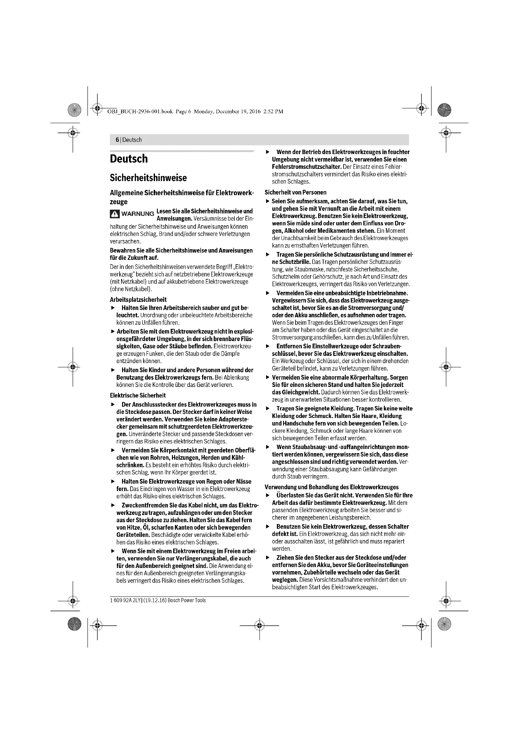 OBJ_BUCH-2936-001.book Page 5 Monday, December 19, 2016 2:52 PM6 | Deutsch 1 609 92A 2LY | (19.12.16) Bosch Power Tools Deutsch Sicherheitshinweise Allgemeine Sicherheitshinweise für Elektrowerk- zeuge Lesen Sie alle Sicherheitshinweise und Anweisungen. Versäumnisse bei der Ein- haltung der Sicherheitshinweise und Anweisungen können elektrischen Schlag, Brand und/oder schwere Verletzungen verursachen. Bewahren Sie alle Sicherheitshinweise und Anweisungen für die Zukunft auf. Der in den Sicherheitshinweisen verwendete Begriff „Elektro- werkzeug“ bezieht sich auf netzbetriebene Elektrowerkzeuge (mit Netzkabel) und auf akkubetriebene Elektrowerkzeuge (ohne Netzkabel). Arbeitsplatzsicherheit Halten Sie Ihren Arbeitsbereich sauber und gut be- leuchtet. Unordnung oder unbeleuchtete Arbeitsbereiche können zu Unfällen führen. Arbeiten Sie mit dem Elektrowerkzeug nicht in explosi- onsgefährdeter Umgebung, in der sich brennbare Flüs- sigkeiten, Gase oder Stäube befinden. Elektrowerkzeu- ge erzeugen Funken, die den Staub oder die Dämpfe entzünden können. Halten Sie Kinder und andere Personen während der Benutzung des Elektrowerkzeugs fern. Bei Ablenkung können Sie die Kontrolle über das Gerät verlieren. Elektrische Sicherheit Der Anschlussstecker des Elektrowerkzeuges muss in die Steckdose passen. Der Stecker darf in keiner Weise verändert werden. Verwenden Sie keine Adapterste- cker gemeinsam mit schutzgeerdeten Elektrowerkzeu- gen. Unveränderte Stecker und passende Steckdosen ver- ringern das Risiko eines elektrischen Schlages. Vermeiden Sie Körperkontakt mit geerdeten Oberflä- chen wie von Rohren, Heizungen, Herden und Kühl- schränken. Es besteht ein erhöhtes Risiko durch elektri- schen Schlag, wenn Ihr Körper geerdet ist. Halten Sie Elektrowerkzeuge von Regen oder Nässe fern. Das Eindringen von Wasser in ein Elektrowerkzeug erhöht das Risiko eines elektrischen Schlages. Zweckentfremden Sie das Kabel nicht, um das Elektro- werkzeug zu tragen, aufzuhängen oder um den Stecker aus der Steckdose zu ziehen. Halten Sie das Kabel fern von Hitze, Öl, scharfen Kanten oder sich bewegenden Geräteteilen. Beschädigte oder verwickelte Kabel erhö- hen das Risiko eines elektrischen Schlages. Wenn Sie mit einem Elektrowerkzeug im Freien arbei- ten, verwenden Sie nur Verlängerungskabel, die auch für den Außenbereich geeignet sind. Die Anwendung ei- nes für den Außenbereich geeigneten Verlängerungska- bels verringert das Risiko eines elektrischen Schlages. Wenn der Betrieb des Elektrowerkzeuges in feuchter Umgebung nicht vermeidbar ist, verwenden Sie einen Fehlerstromschutzschalter. Der Einsatz eines Fehler- stromschutzschalters vermindert das Risiko eines elektri- schen Schlages. Sicherheit von Personen Seien Sie aufmerksam, achten Sie darauf, was Sie tun, und gehen Sie mit Vernunft an die Arbeit mit einem Elektrowerkzeug. Benutzen Sie kein Elektrowerkzeug, wenn Sie müde sind oder unter dem Einfluss von Dro- gen, Alkohol oder Medikamenten stehen. Ein Moment der Unachtsamkeit beim Gebrauch des Elektrowerkzeuges kann zu ernsthaften Verletzungen führen. Tragen Sie persönliche Schutzausrüstung und immer ei- ne Schutzbrille. Das Tragen persönlicher Schutzausrüs- tung, wie Staubmaske, rutschfeste Sicherheitsschuhe, Schutzhelm oder Gehörschutz, je nach Art und Einsatz des Elektrowerkzeuges, verringert das Risiko von Verletzungen. Vermeiden Sie eine unbeabsichtigte Inbetriebnahme. Vergewissern Sie sich, dass das Elektrowerkzeug ausge- schaltet ist, bevor Sie es an die Stromversorgung und/ oder den Akku anschließen, es aufnehmen oder tragen. Wenn Sie beim Tragen des Elektrowerkzeuges den Finger am Schalter haben oder das Gerät eingeschaltet an die Stromversorgung anschließen, kann dies zu Unfällen führen. Entfernen Sie Einstellwerkzeuge oder Schrauben- schlüssel, bevor Sie das Elektrowerkzeug einschalten. Ein Werkzeug oder Schlüssel, der sich in einem drehenden Geräteteil befindet, kann zu Verletzungen führen.