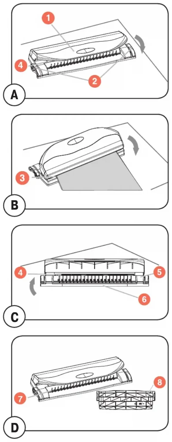 nach oben auf die gewünschte Weite öffnen C. b. Die gelochten Dokumente auf den geöffneten Binderücken legen und die Bindegriffe nach unten drücken, um den Rücken zu schließen. Die gebundenen Dokumente entfernen. c. Den Binderücken anhand der Stärke des Papier- stapels auswählen. Die folgenden Größenangaben dienen als Anhaltspunkte für die richtige Auswahl. Binderücken- größe (mm) (Zoll) Blätter 6 1/4 1-12 8 5/16 13-20 10 3/8 21-35 12 1/2 36-50 Reinigen des Abfallbehälters Den Auszug