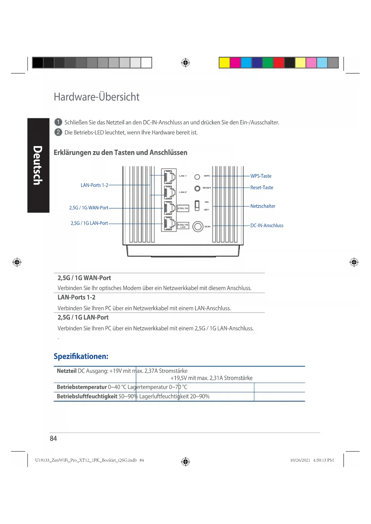 Schließen Sie das Netzteil an den DC-IN-Anschluss an und drücken Sie den Ein-/Ausschalter. Die Betriebs-LED leuchtet, wenn Ihre Hardware bereit ist. Erklärungen zu den Tasten und Anschlüssen 2,5G / 1G WAN-Port Verbinden Sie Ihr optisches Modem über ein Netzwerkkabel mit diesem Anschluss. LAN-Ports 1-2 Verbinden Sie Ihren PC über ein Netzwerkkabel mit einem LAN-Anschluss.Netzteil DC Ausgang: +19V mit max. 2,37A Stromstärke +19,5V mit max. 2,31A StromstärkeBetriebstemperatur 0~40 °C Lagertemperatur 0~70 °CBetriebsluftfeuchtigkeit 50~90% Lagerluftfeuchtigkeit 20~90% Spezikationen: LAN-Ports 1-2WPS-TasteReset-TasteNetzschalterDC-IN-Anschluss 2,5G / 1G LAN-Port Verbinden Sie Ihren PC über ein Netzwerkkabel mit einem 2,5G / 1G LAN-Anschluss. 2,5G / 1G WAN-Port2,5G / 1G LAN-Port U19133_ZenWiFi_Pro_XT12_1PK_Booklet_QSG.indb 84U19133_ZenWiFi_Pro_XT12_1PK_Booklet_QSG.indb 84 10/26/2021 4:50:13 PM10/26/2021 4:50:13 PM85 Deutsch Vor der Einrichtung Einen Einzelrouter einrichten