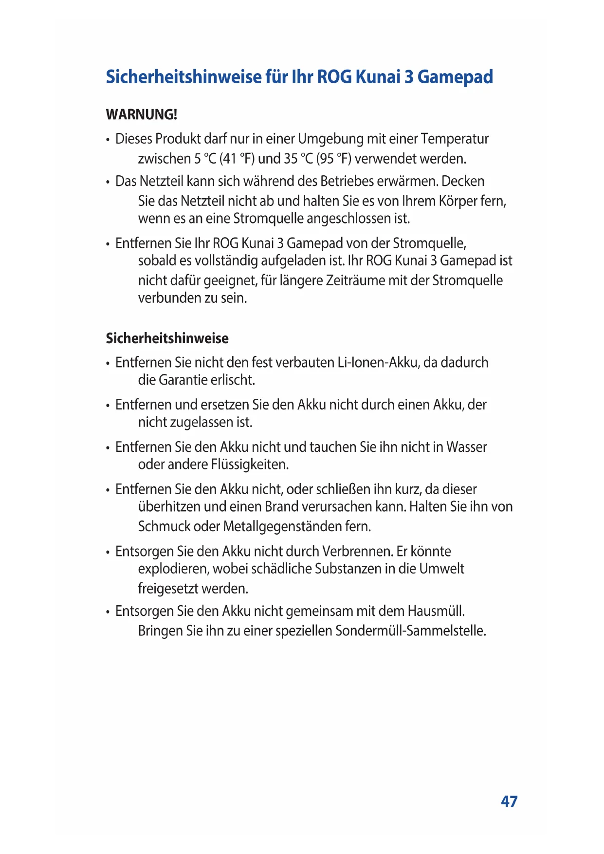 - Entfernen Sie Ihr ROG Kunai 3 Gamepad von der Stromquelle, sobald es vollständig aufgeladen ist. Ihr ROG Kunai 3 Gamepad ist nicht dafür geeignet, für längere Zeiträume mit der Stromquelle verbunden zu sein. Sicherheitshinweise