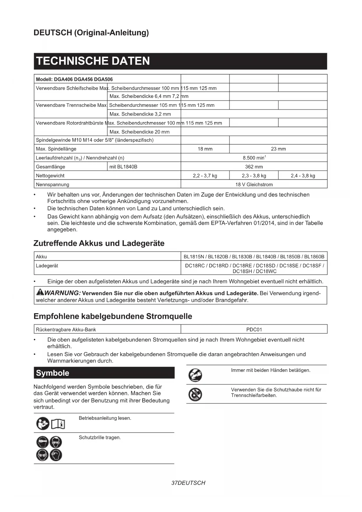 NOTE : Il se peut que certains éléments de la liste soient compris dans l’emballage de l’outil en tant qu’accessoires standard. Ils peuvent varier d’un pays à l’autre.37 DEUTSCH DEUTSCH (Original-Anleitung) TECHNISCHE DATEN Modell: DGA406 DGA456 DGA506 Verwendbare Schleifscheibe Max. Scheibendurchmesser 100 mm 115 mm 125 mm Max. Scheibendicke 6,4 mm 7,2 mm Verwendbare Trennscheibe Max. Scheibendurchmesser 105 mm 115 mm 125 mm Max. Scheibendicke 3,2 mm Verwendbare Rotordrahtbürste Max. Scheibendurchmesser 100 mm 115 mm 125 mm Max. Scheibendicke 20 mm Spindelgewinde M10 M14 oder 5/8″ (länderspezisch) Max. Spindellänge 18 mm 23 mm Leerlaufdrehzahl (n