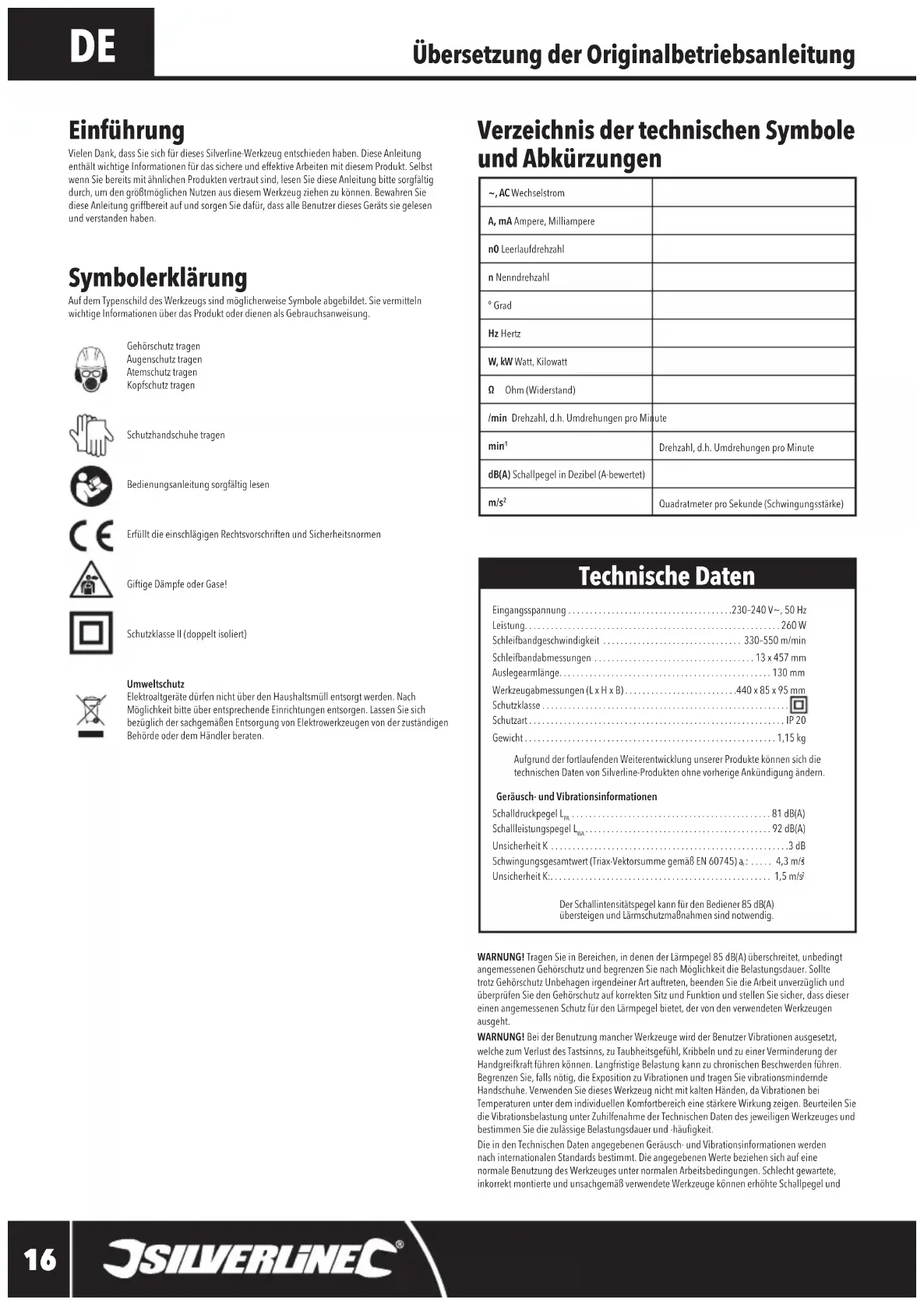 Der Schallintensitätspegel kann für den Bediener 85 dB(A) übersteigenundLärmschutzmaßnahmensindnotwendig. Einführung Vielen Dank, dass Sie sich für dieses Silverline-Werkzeug entschieden haben. Diese Anleitung enthältwichtigeInformationenfürdassichereundeffektiveArbeitenmitdiesemProdukt.SelbstwennSiebereitsmitähnlichenProduktenvertrautsind,lesenSiedieseAnleitungbittesorgfältigdurch,umdengrößtmöglichenNutzenausdiesemWerkzeugziehenzukönnen.BewahrenSiediese Anleitung griffbereit auf und sorgen Sie dafür, dass alle Benutzer dieses Geräts sie gelesen und verstanden haben. Technische Daten 247820/976084_Manual.indd 16 28/06/2019 09:12Elektrobandfeile, 260 W, 13 mm