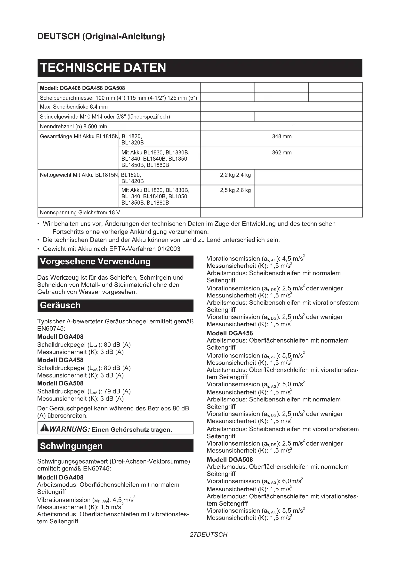 - Gewicht mit Akku nach EPTA-Verfahren 01/2003 Vorgesehene Verwendung Das Werkzeug ist für das Schleifen, Schmirgeln und Schneiden von Metall- und Steinmaterial ohne den Gebrauch von Wasser vorgesehen. Geräusch Typischer A-bewerteter Geräuschpegel ermittelt gemäß EN60745: Modell DGA408 Schalldruckpegel (L