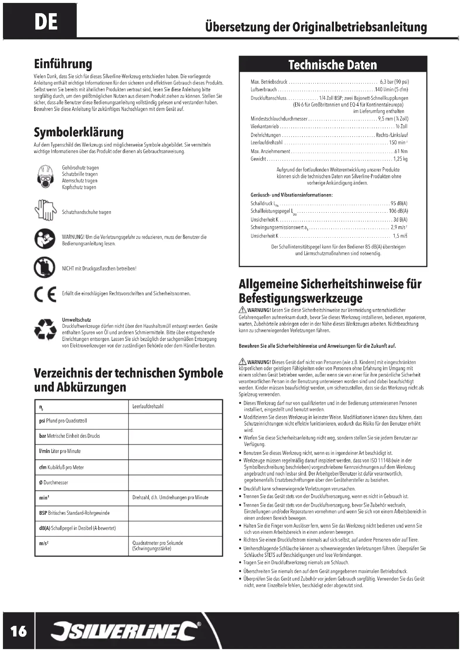 Allgemeine Sicherheitshinweise für Befestigungswerkzeuge WARNUNG! Lesen Sie diese Sicherheitshinweise zur Vermeidung unterschiedlicher Gefahrenquellen aufmerksam durch, bevor Sie dieses Werkzeug installieren, bedienen, reparieren, warten, Zubehörteile anbringen oder in der Nähe dieses Werkzeuges arbeiten. Nichtbeachtung kann zu schwerwiegenden Verletzungen führen.Bewahren Sie alle Sicherheitshinweise und Anweisungen für die Zukunft auf. WARNUNG! Dieses Gerät darf nicht von Personen (wie z.B. Kindern) mit eingeschränkten körperlichen oder geistigen Fähigkeiten oder von Personen ohne Erfahrung im Umgang mit einem solchen Gerät betrieben werden, außer wenn sie von einer für ihre persönliche Sicherheit verantwortlichen Person in der Benutzung unterwiesen worden sind und dabei beaufsichtigt werden. Kinder müssen beaufsichtigt werden, um sicherzustellen, dass sie das Werkzeug nicht als Spielzeug verwenden.• Dieses Werkzeug darf nur von qualizierten und in der Bedienung unterwiesenen Personen installiert, eingestellt und benutzt werden.• Modizieren Sie dieses Werkzeug in keinster Weise. Modikationen können dazu führen, dass Schutzeinrichtungen nicht effektiv funktionieren, wodurch das Risiko für den Benutzer erhöht wird.• Werfen Sie diese Sicherheitsanleitung nicht weg, sondern stellen Sie sie jedem Benutzer zur Verfügung.• Benutzen Sie dieses Werkzeug nicht, wenn es in irgendeiner Art beschädigt ist.• Werkzeuge müssen regelmäßig darauf inspiziert werden, dass von ISO 11148 (wie in der Symbolbeschreibung beschrieben) vorgeschriebene Kennzeichnungen auf dem Werkzeug angebracht und noch lesbar sind. Der Arbeitgeber/Benutzer ist dafür verantwortlich, gegebenenfalls Ersatzbeschriftungen über den Gerätehersteller zu beziehen.• Druckluft kann schwerwiegende Verletzungen verursachen.• Trennen Sie das Gerät stets von der Druckluftversorgung, wenn es nicht in Gebrauch ist.• Trennen Sie das Gerät stets von der Druckluftversorgung, bevor Sie Zubehör wechseln, Einstellungen und/oder Reparaturen vornehmen und wenn Sie sich von einem Arbeitsbereich in einen anderen Bereich bewegen.• Halten Sie die Finger vom Auslöser fern, wenn Sie das Werkzeug nicht bedienen und wenn Sie sich von einem Arbeitsbereich in einen anderen bewegen.• Richten Sie einen Druckluftstrom niemals auf sich selbst, auf andere Personen oder auf Tiere. • Umherschlagende Schläuche können zu schwerwiegenden Verletzungen führen. Überprüfen Sie Schläuche STETS auf Beschädigungen und lose Verbindungen.• Tragen Sie ein Druckluftwerkzeug niemals am Schlauch.• Überschreiten Sie niemals den auf dem Gerät angegebenen maximalen Betriebsdruck.• Überprüfen Sie das Gerät und Zubehör vor jedem Gebrauch sorgfältig. Verwenden Sie das Gerät nicht, wenn Einzelteile fehlen, beschädigt oder abgenutzt sind. Übersetzung der Originalbetriebsanleitung Einführung Vielen Dank, dass Sie sich für dieses Silverline-Werkzeug entschieden haben. Die vorliegende Anleitung enthält wichtige Informationen für den sicheren und effektiven Gebrauch dieses Produkts. Selbst wenn Sie bereits mit ähnlichen Produkten vertraut sind, lesen Sie diese Anleitung bitte sorgfältig durch, um den größtmöglichen Nutzen aus diesem Produkt ziehen zu können. Stellen Sie sicher, dass alle Benutzer diese Bedienungsanleitung vollständig gelesen und verstanden haben. Bewahren Sie diese Anleitung für zukünftiges Nachschlagen mit dem Gerät auf. Technische Daten Symbolerklärung Auf dem Typenschild des Werkzeugs sind möglicherweise Symbole abgebildet. Sie vermitteln wichtige Informationen über das Produkt oder dienen als Gebrauchsanweisung.Gehörschutz tragen Schutzbrille tragenAtemschutz tragenKopfschutz tragenSchutzhandschuhe tragenWARNUNG! Um die Verletzungsgefahr zu reduzieren, muss der Benutzer die Bedienungsanleitung lesen.NICHT mit Druckgasaschen betreiben!Erfüllt die einschlägigen Rechtsvorschriften und Sicherheitsnormen. Umweltschutz Druckluftwerkzeuge dürfen nicht über den Haushaltsmüll entsorgt werden. Geräte enthalten Spuren von Öl und anderen Schmiermitteln. Bitte über entsprechende Einrichtungen entsorgen. Lassen Sie sich bezüglich der sachgemäßen Entsorgung von Elektrowerkzeugen von der zuständigen Behörde oder dem Händler beraten.