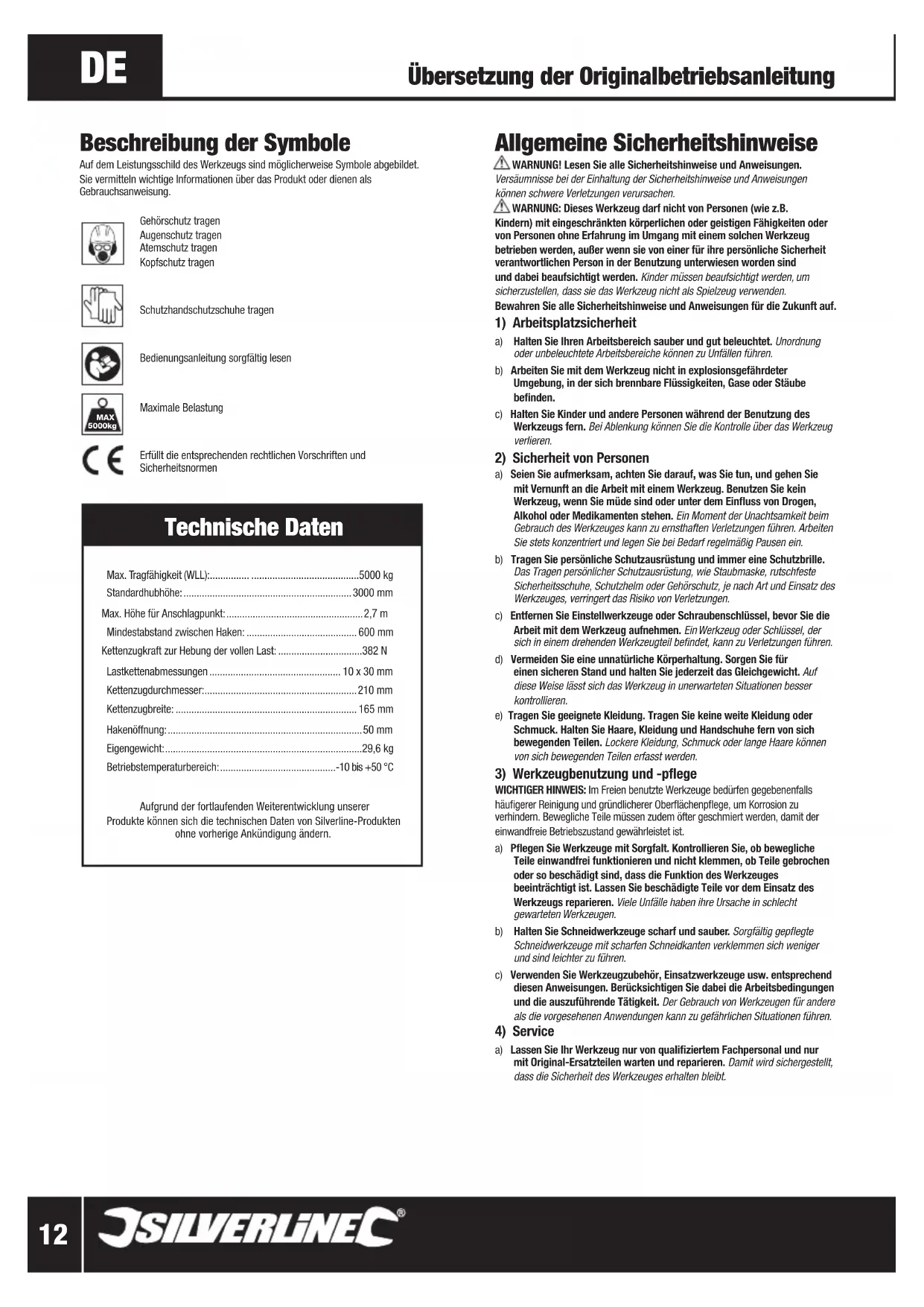 a) Lassen Sie Ihr Werkzeug nur von qualifiziertem Fachpersonal und nur mit Original-Ersatzteilen warten und reparieren. Damit wird sichergestellt, dass die Sicherheit des Werkzeuges erhalten bleibt. Beschreibung der Symbole Auf dem Leistungsschild des Werkzeugs sind möglicherweise Symbole abgebildet. Sie vermitteln wichtige Informationen über das Produkt oder dienen als Gebrauchsanweisung. Gehörschutz tragen Augenschutz tragen Atemschutz tragenKopfschutz tragenSchutzhandschutzschuhe tragenBedienungsanleitung sorgfältig lesenMaximale BelastungErfüllt die entsprechenden rechtlichen Vorschriften und Sicherheitsnormen Technische Daten Max. Tragfähigkeit (WLL):............... .........................................5000 kg Standardhubhöhe: ................................................................ 3000 mm Max. Höhe für Anschlagpunkt: .................................................... 2,7 m Mindestabstand zwischen Haken: .......................................... 600 mm Kettenzugkraft zur Hebung der vollen Last: ................................382 N Lastkettenabmessungen .................................................. 10 x 30 mm Kettenzugdurchmesser: ..........................................................210 mm Kettenzugbreite: ..................................................................... 165 mm Hakenöffnung: ..........................................................................50 mm Eigengewicht: ...........................................................................29,6 kg Betriebstemperaturbereich: ............................................-10 bis +50 °C Aufgrund der fortlaufenden Weiterentwicklung unserer Produkte können sich die technischen Daten von Silverline-Produkten ohne vorherige Ankündigung ändern. Übersetzung der Originalbetriebsanleitung MAX 5000kg 282517_Z1MANPRO1.indd 12 04/08/2015 14:58www.silverlinetools.com