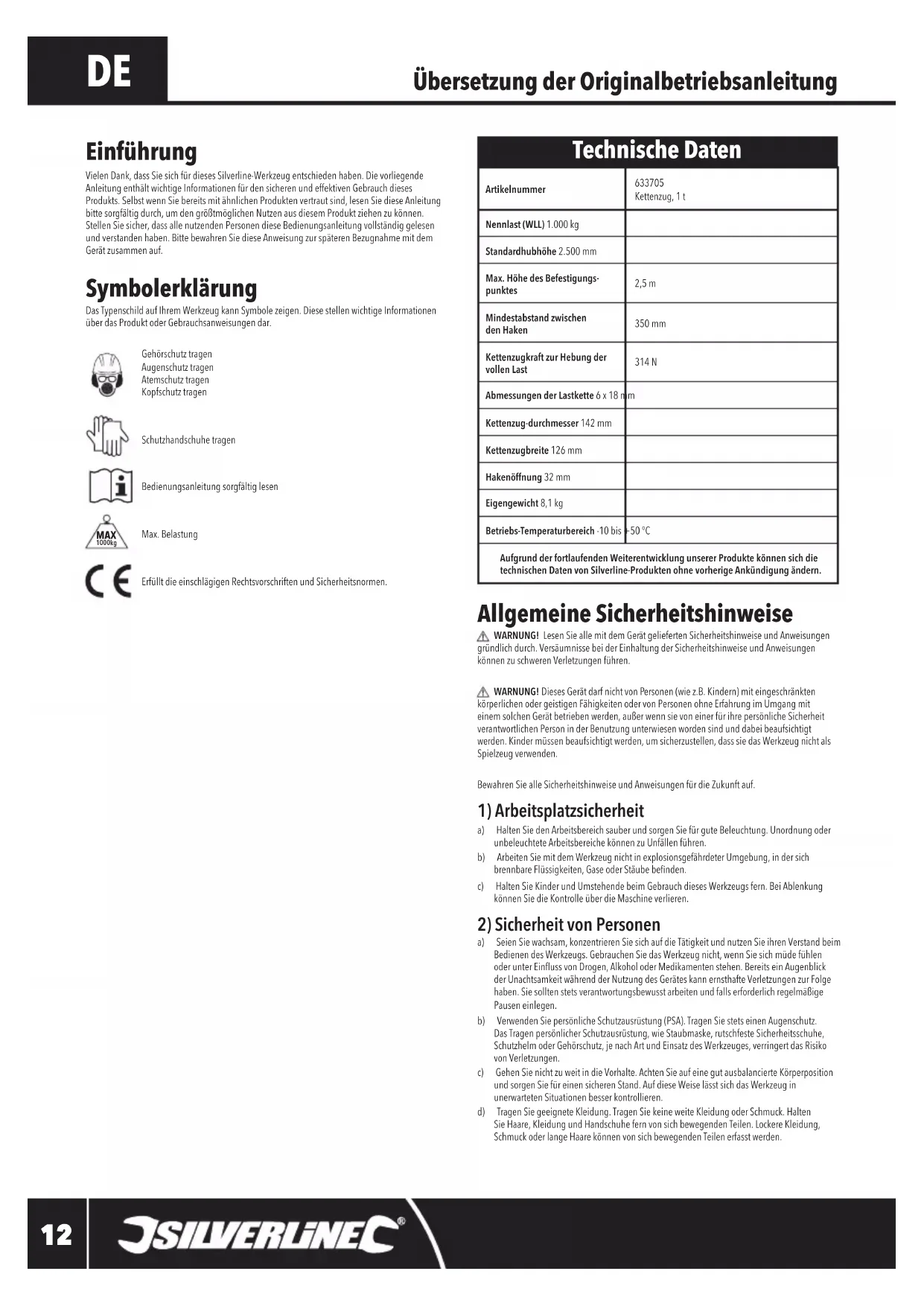 a) SeienSiewachsam,konzentrierenSiesichaufdieTätigkeitundnutzenSieihrenVerstandbeimBedienendesWerkzeugs.GebrauchenSiedasWerkzeugnicht,wennSiesichmüdefühlenoderunterEinussvonDrogen,AlkoholoderMedikamentenstehen.BereitseinAugenblickderUnachtsamkeitwährendderNutzungdesGeräteskannernsthafteVerletzungenzurFolgehaben.SiesolltenstetsverantwortungsbewusstarbeitenundfallserforderlichregelmäßigePausen einlegen. b) VerwendenSiepersönlicheSchutzausrüstung(PSA).TragenSiestetseinenAugenschutz.DasTragenpersönlicherSchutzausrüstung,wieStaubmaske,rutschfesteSicherheitsschuhe,SchutzhelmoderGehörschutz,jenachArtundEinsatzdesWerkzeuges,verringertdasRisikovonVerletzungen.c) GehenSienichtzuweitindieVorhalte.AchtenSieaufeinegutausbalancierteKörperpositionundsorgenSiefüreinensicherenStand.AufdieseWeiselässtsichdasWerkzeuginunerwartetenSituationenbesserkontrollieren.d) TragenSiegeeigneteKleidung.TragenSiekeineweiteKleidungoderSchmuck.HaltenSieHaare,KleidungundHandschuhefernvonsichbewegendenTeilen.LockereKleidung,SchmuckoderlangeHaarekönnenvonsichbewegendenTeilenerfasstwerden. Übersetzung der Originalbetriebsanleitung Symbolerklärung DasTypenschildaufIhremWerkzeugkannSymbolezeigen.DiesestellenwichtigeInformationenüberdasProduktoderGebrauchsanweisungendar.Gehörschutztragen Augenschutz tragen Atemschutz tragen Kopfschutz tragenSchutzhandschuhe tragenBedienungsanleitungsorgfältiglesenMax.BelastungErfülltdieeinschlägigenRechtsvorschriftenundSicherheitsnormen. Einführung VielenDank,dassSiesichfürdiesesSilverline-Werkzeugentschiedenhaben.DievorliegendeAnleitungenthältwichtigeInformationenfürdensicherenundeffektivenGebrauchdiesesProdukts.SelbstwennSiebereitsmitähnlichenProduktenvertrautsind,lesenSiedieseAnleitungbittesorgfältigdurch,umdengrößtmöglichenNutzenausdiesemProduktziehenzukönnen.StellenSiesicher,dassallenutzendenPersonendieseBedienungsanleitungvollständiggelesenundverstandenhaben.BittebewahrenSiedieseAnweisungzurspäterenBezugnahmemitdemGerätzusammenauf. MAX 1000kg Technische Daten Artikelnummer633705Kettenzug,1tNennlast (WLL) 1.000 kgStandardhubhöhe 2.500 mmMax. Höhe des Befestigungs-punktes2,5mMindestabstand zwischen den Haken350 mmKettenzugkraft zur Hebung der vollen Last314NAbmessungen der Lastkette 6x18mmKettenzug-durchmesser 142 mmKettenzugbreite 126 mmHakenöffnung 32 mmEigengewicht 8,1kgBetriebs-Temperaturbereich -10bis+50°CAufgrund der fortlaufenden Weiterentwicklung unserer Produkte können sich die technischen Daten von Silverline-Produkten ohne vorherige Ankündigung ändern. 633705_OwnerManual.indd 12633705_OwnerManual.indd 12 18/10/2023 08:1218/10/2023 08:12Kettenzug