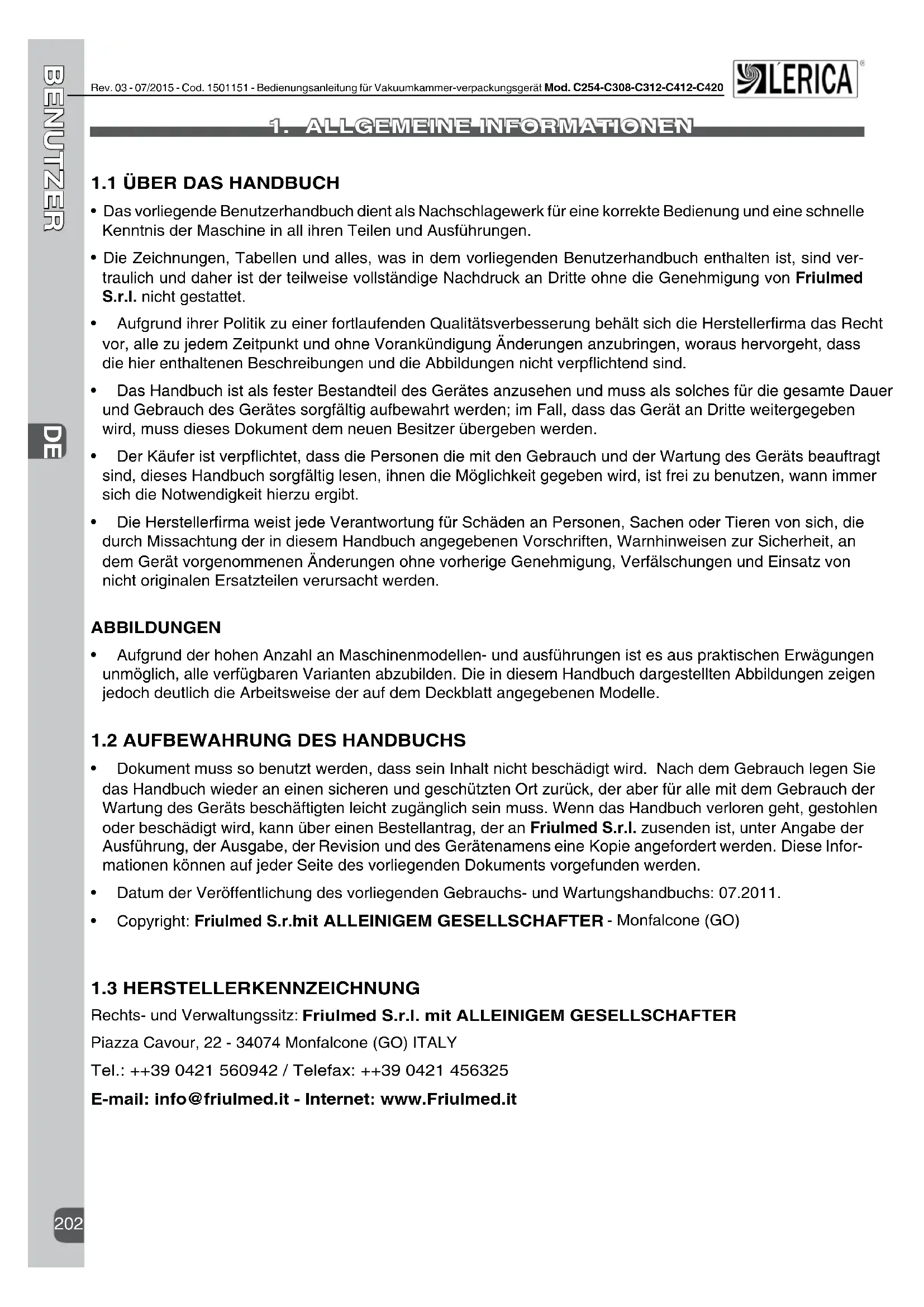 BENUTZER Rev. 03 - 07/2015 - Cod. 1501151 - Bedienungsanleitung für Vakuumkammer-verpackungsgerät Mod. C254-C308-C312-C412-C420 1.aLLGEMEINEINFORMaTIONEN 1.1übERdaShaNdbUCh