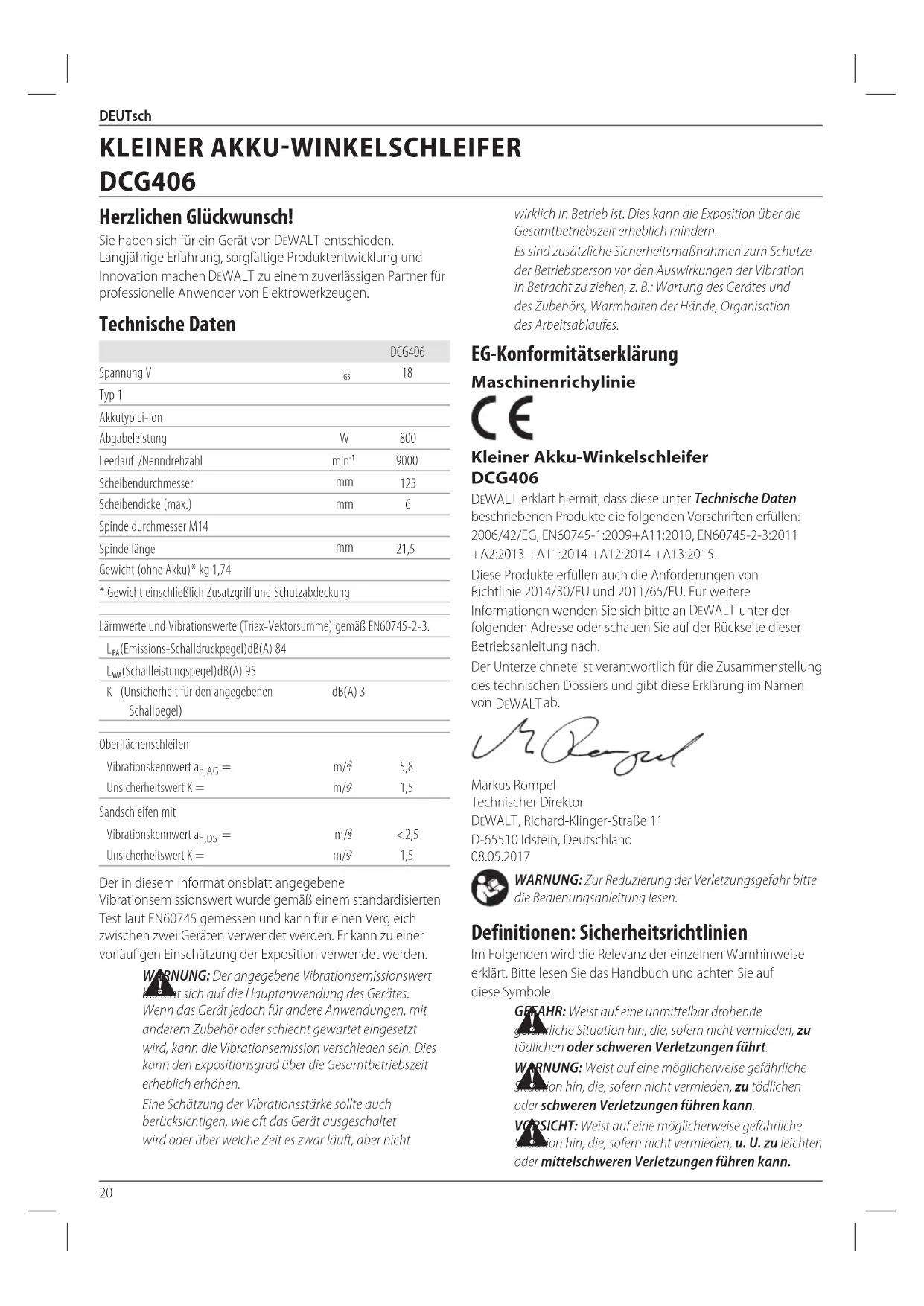 Der Unterzeichnete ist verantwortlich für die Zusammenstellung des technischen Dossiers und gibt diese Erklärung im Namen von DEWALT ab.