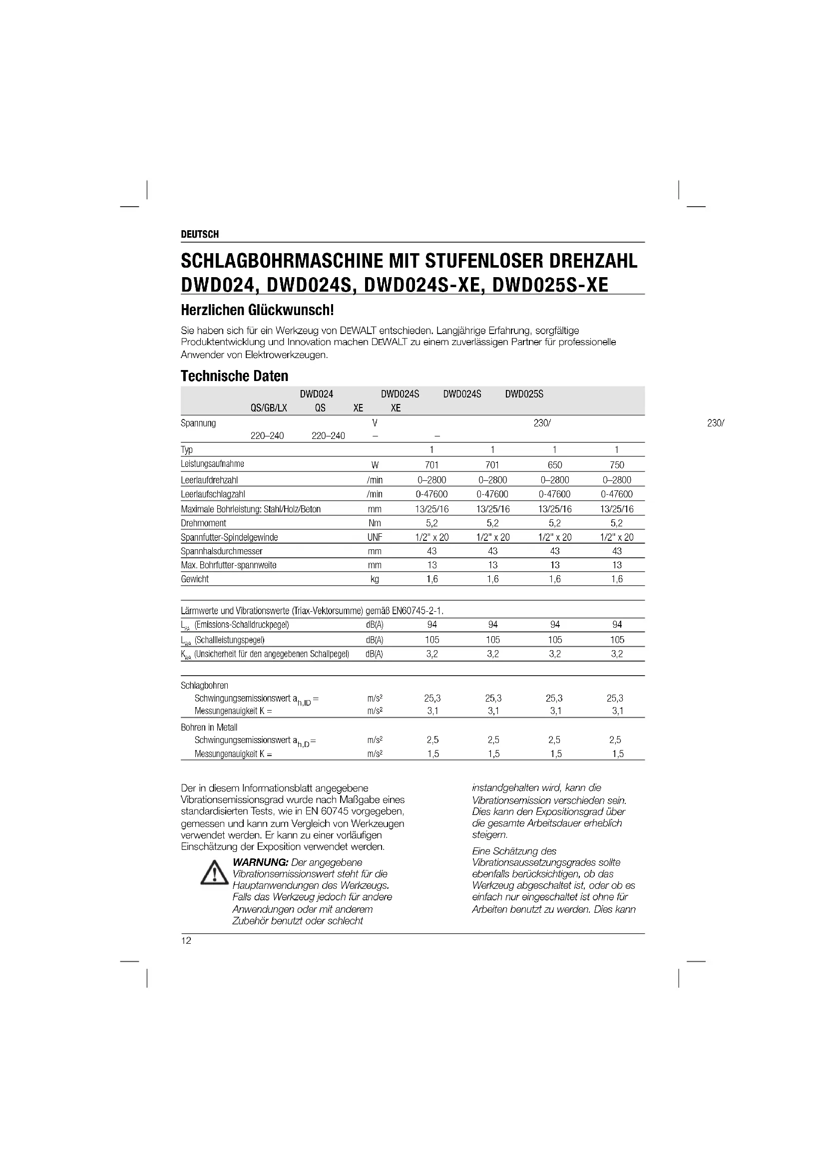 DWD024KS - Bohrmaschine DEWALT - Kostenlose Bedienungsanleitung
