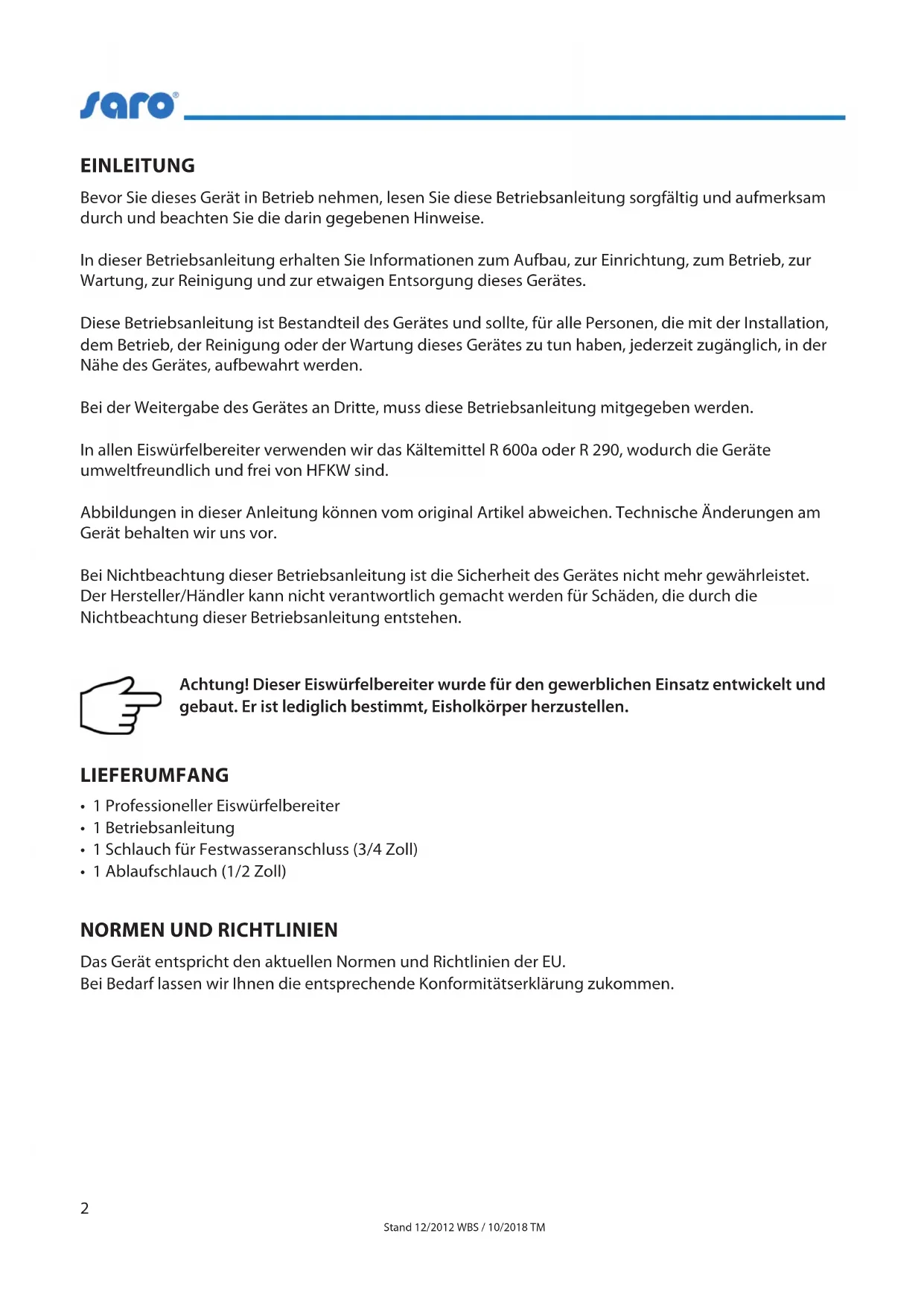 - Fehler Ursache Abhilfe Das Gerät funktioniert nicht Das Gerät funktioniert nicht. Umgebungstemperatur ist unter 10°C. Ausschalten und nach 5 Minuten Zeit wieder einschalten. Das Gerät wieder in Betrieb nehmen, wenn die Temperatur wieder höher ist. Warnanzeige für zu wenig Wasser leuchtet auf Wasserzuführung gestört. Ventil beschädigt. Wasserdruck zu Niedrig. Prüfen Sie den Zulauf Ventil prüfen, ggfs. austauschen lassen. Der Wasserdruck muss mindestens 1 kg/cm2 betragen. Der Kompressor arbeitet nicht Zu wenig Wasser. Vorratsbehälter voll. Prüfen Sie die Wasserzuführung. Leeren Sie den Behälter. Der Kompressor arbeitet, es werden aber keine Eiswürfel produziert Leck im Kühlsystem. Kondensator verstaubt. Kühlsystem vom Fachmann überprüfen lassen. Kondensator staubfrei machen, Lüftungsschlitze reinigen Eiswürfel fallen gar nicht oder nur zum Teil in den Behälter Umgebungstemperatur oder Wassertemperatur sind zu niedrig. Ventil ist beschädigt. Umgebungstemperatur muss mindestens 10°C und Wassertemperatur mindestens 7°C betragen. Ventil austauschen Die Eiswürfel pappen immer zusammen Vorratsbehälter ist nicht ausreichend gekühlt. Häug entleeren. Nicht über Nacht im Vorratsbehälter lassen. Temperatur regeln. Optische Fehlermeldung durch Kontrolllampen an der Bedienblende: 1x Blinken: Wassertemperatursensor (325- 5157) ist defekt. 2x Blinken: Umgebungstemperatursensor (325-5125) ist defekt. 3x Blinken: Vorratsbehältertemperaturfühler zwecks Vorratsstau (325-5009) ist defekt Muss vom Fachmann ausgewechselt werden. Muss vom Fachmann ausgewechselt werden. Muss vom Fachmann ausgewechselt werden.16 Stand 12/2012 WBS / 10/2018 TM Hergestellt in P.R.C. für SARO Gastro-Products GmbH Sandbahn 6, 46446 Emmerich am Rhein, Germany Tel. +49(0)2822 9258-0 Fax +49(0)2822 18192 E-Mail info@saro.de ENTSORGUNG Hat das Gerät einmal ausgedient, dann entsorgen Sie dieses bitte ordnungsgemäß an einer Sammelstelle für Elektrogeräte. Elektrogeräte gehören nicht in den Hausmüll. Über Adressen und Önungszeiten von Sammelstellen informiert Sie Ihre zuständige Verwaltung. Nur so ist sichergestellt, dass Altgeräte fachgerecht entsorgt und verwertet werden. Vielen Dank! VERPACKUNGS-ENTSORGUNG Die Verpackungsmaterialien bitte entsprechend trennen und den zuständigen Sammelstellen zur Wiederverwertung und zur Umweltschohnung zuführen.17 Stand 12/2012 WBS / 10/2018 TM Dear customer, thank you for choosing our ice cube maker. We hope you will enjoy our advanced product. The ice cube makers of the „EB“ series have features that support you in your daily work routine and at the same time protect the environment. The use of our new innovative technology guarantees a long service life and signicantly reduces the noise level. The hollow cones produced promise a great advantage, as these hollow ice cones can be used in mixers without overloading the knives. In addition, all ice cube makers have a water recycling system that saves up to 80% water compared to other appliances without a recycling system. An insulated reservoir ensures that the hollow cones are retained for a long time. This reduces energy consumption. Any condensation that occurs is automatically removed. Due to the compact design and the retractable removal aps, the units can also be installed in a small space and the high-quality stainless steel housing enables easy cleaning. In all ice cube makers we use the refrigerant R 600a or R 290, which makes them environmentally friendly and HFC-free. The ice cube makers are used for commercial use in hotels, restaurants, canteens, bars, etc. Saro does not warrant that the equipment will be used for any purpose other than that for which it is intended. We hope you enjoy your new SARO ice cube maker!18 Stand 12/2012 WBS / 10/2018 TM CONTENT Introduction p. 19