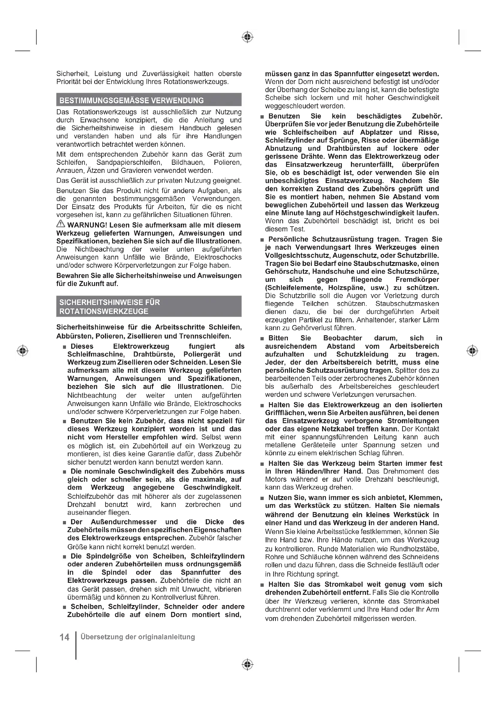 Übersetzung der originalanleitung■ Legen Sie Ihr Werkzeug nie ab, bevor das Zubehörteil vollständig zum Stillstand gekommen ist. Das drehende Zubehörteil könnte mit der Oberfläche, auf der es abgelegt wurde, in Kontakt kommen und es besteht die Gefahr, dass Sie die Kontrolle über das Werkzeug verlieren. ■ Nachdem Sie Zubehörteile gewechselt haben oder Einstellungen vorgenommen haben, stellen Sie sicher, dass die Spannmutter, das Spannfutter oder andere Einstellvorrichtungen festgezogen sind. Lockere Zubehörteile können sich unerwartet verschieben und zu einem Kontrollverlust führen, lose drehende Zubehörteile können umhergeschleudert werden. ■ Lassen Sie Ihr Werkzeug nicht eingeschaltet, während Sie es transportieren. Das sich drehende Zubehörteil könnte sich in Ihren Kleidern verfangen und Sie schwer verletzen. ■ Säubern Sie regelmäßig die Lüftungsspalten des Werkzeugs. Die Motorlüftung lässt Staub ins Motorgehäuseinnere eindringen, dies kann zur Ansammlung von Metallpartikeln führen und Elektroschocks auslösen. ■ Benutzen Sie Ihr Werkzeug nicht in der Nähe leicht entflammbarer Produkte. Funken könnten sie entflammen. ■ Benutzen Sie kein Zubehör, das Kühlwasser benötigt. Die Benutzung von Wasser oder Kühlflüssigkeiten kann elektrische Schläge oder Elektroschocks verursachen.