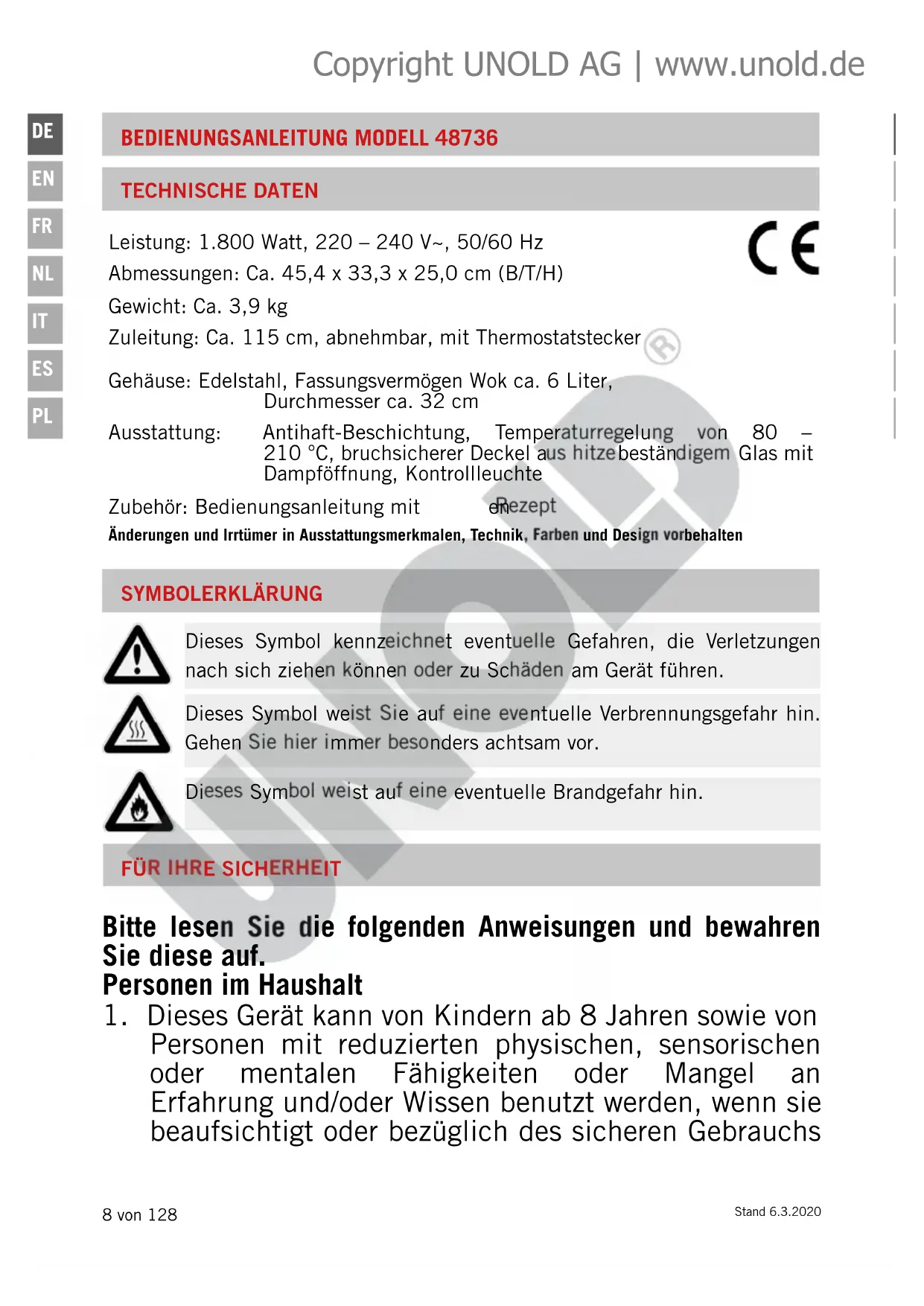 Personen mit reduzierten physischen, sensorischen oder mentalen Fähigkeiten oder Mangel an Erfahrung und/oder Wissen benutzt werden, wenn sie beaufsichtigt oder bezüglich des sicheren Gebrauchs SYMBOLERKLÄRUNG Dieses Symbol kennzeichnet eventuelle Gefahren, die Verletzungen nach sich ziehen können oder zu Schäden am Gerät führen. Dieses Symbol weist Sie auf eine eventuelle Verbrennungsgefahr hin. Gehen Sie hier immer besonders achtsam vor. Leistung: 1.800 Watt, 220 – 240 V~, 50/60 Hz Abmessungen: Ca. 45,4 x 33,3 x 25,0 cm (B/T/H) Gewicht: Ca. 3,9 kg Zuleitung: Ca. 115 cm, abnehmbar, mit Thermostatstecker Gehäuse: Edelstahl, Fassungsvermögen Wok ca. 6 Liter, Durchmesser ca. 32 cm Ausstattung: Antihaft-Beschichtung, Temperaturregelung von 80 – 210 °C, bruchsicherer Deckel aus hitzebeständigem Glas mit Dampföffnung, Kontrollleuchte Zubehör: Bedienungsanleitung mit Rezepten Änderungen und Irrtümer in Ausstattungsmerkmalen, Technik, Farben und Design vorbehalten Dieses Symbol weist auf eine eventuelle Brandgefahr hin. Copyright UNOLD AG | www.unold.deStand 6.3.2020 9 von 128