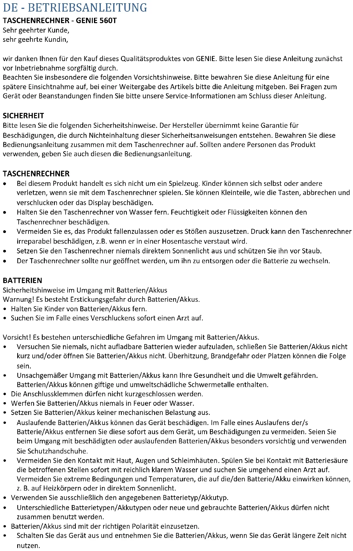 Sehr geehrter Kunde, sehr geehrte Kundin, wir danken Ihnen für den Kauf dieses Qualitätsproduktes von GENIE. Bitte lesen Sie diese Anleitung zunächst vor Inbetriebnahme sorgfältig durch. Beachten Sie insbesondere die folgenden Vorsichtshinweise. Bitte bewahren Sie diese Anleitung für eine spätere Einsichtnahme auf, bei einer Weitergabe des Artikels bitte die Anleitung mitgeben. Bei Fragen zum Gerät oder Beanstandungen finden Sie bitte unsere Service-Informationen am Schluss dieser Anleitung. SICHERHEIT Bitte lesen Sie die folgenden Sicherheitshinweise. Der Hersteller übernimmt keine Garantie für Beschädigungen, die durch Nichteinhaltung dieser Sicherheitsanweisungen entstehen. Bewahren Sie diese Bedienungsanleitung zusammen mit dem Taschenrechner auf. Sollten andere Personen das Produkt verwenden, geben Sie auch diesen die Bedienungsanleitung. TASCHENRECHNER
