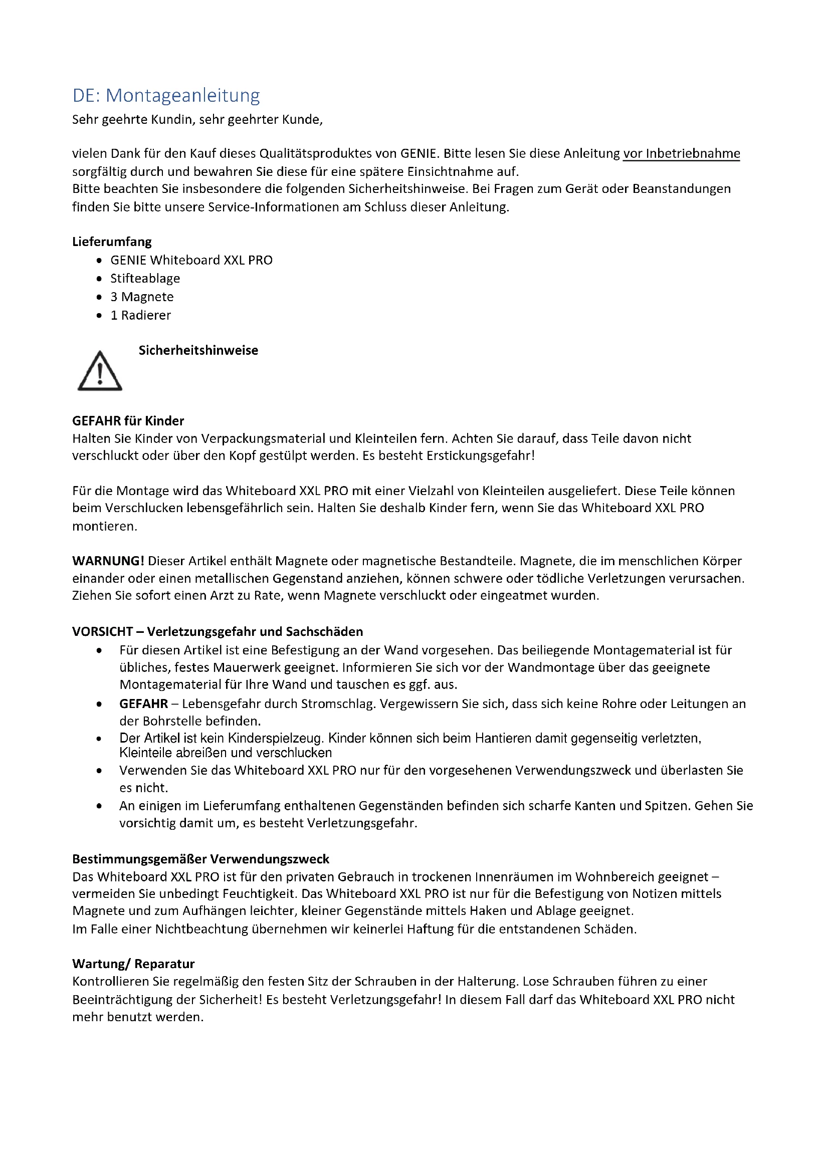 - An einigen im Lieferumfang enthaltenen Gegenständen befinden sich scharfe Kanten und Spitzen. Gehen Sie vorsichtig damit um, es besteht Verletzungsgefahr. Bestimmungsgemäßer Verwendungszweck Das Whiteboard XXL PRO ist für den privaten Gebrauch in trockenen Innenräumen im Wohnbereich geeignet – vermeiden Sie unbedingt Feuchtigkeit. Das Whiteboard XXL PRO ist nur für die Befestigung von Notizen mittels Magnete und zum Aufhängen leichter, kleiner Gegenstände mittels Haken und Ablage geeignet. Im Falle einer Nichtbeachtung übernehmen wir keinerlei Haftung für die entstandenen Schäden. Wartung/ Reparatur Kontrollieren Sie regelmäßig den festen Sitz der Schrauben in der Halterung. Lose Schrauben führen zu einer Beeinträchtigung der Sicherheit! Es besteht Verletzungsgefahr! In diesem Fall darf das Whiteboard XXL PRO nicht mehr benutzt werden.Pflegehinweis Bitte nur mit einem Staubtuch oder feuchtem Lappen reinigen, Keine scheuernden Putzmittel verwenden! Benutzen Sie keine scharfen oder spitzen Gegenstände auf dem Whiteboard XXL PRO. Das Whiteboard XXL PRO ist kratzempfindlich und könnte dabei beschädigt werden. Montage
